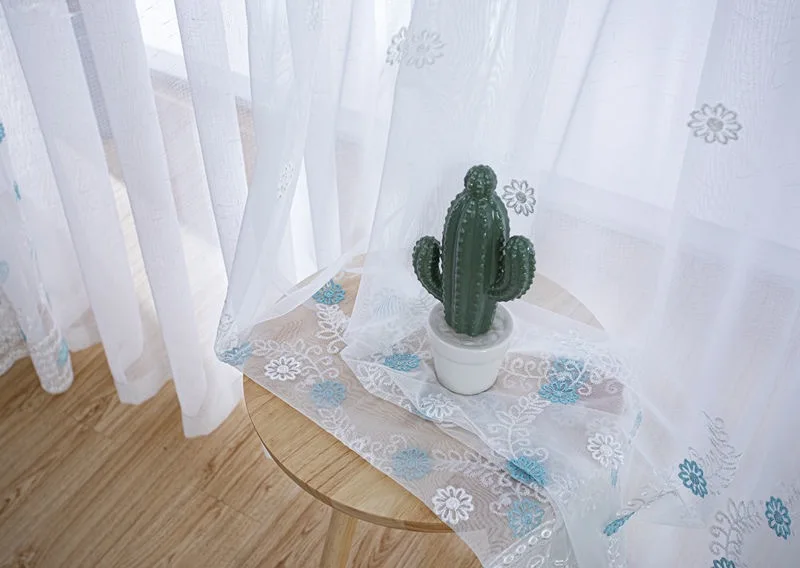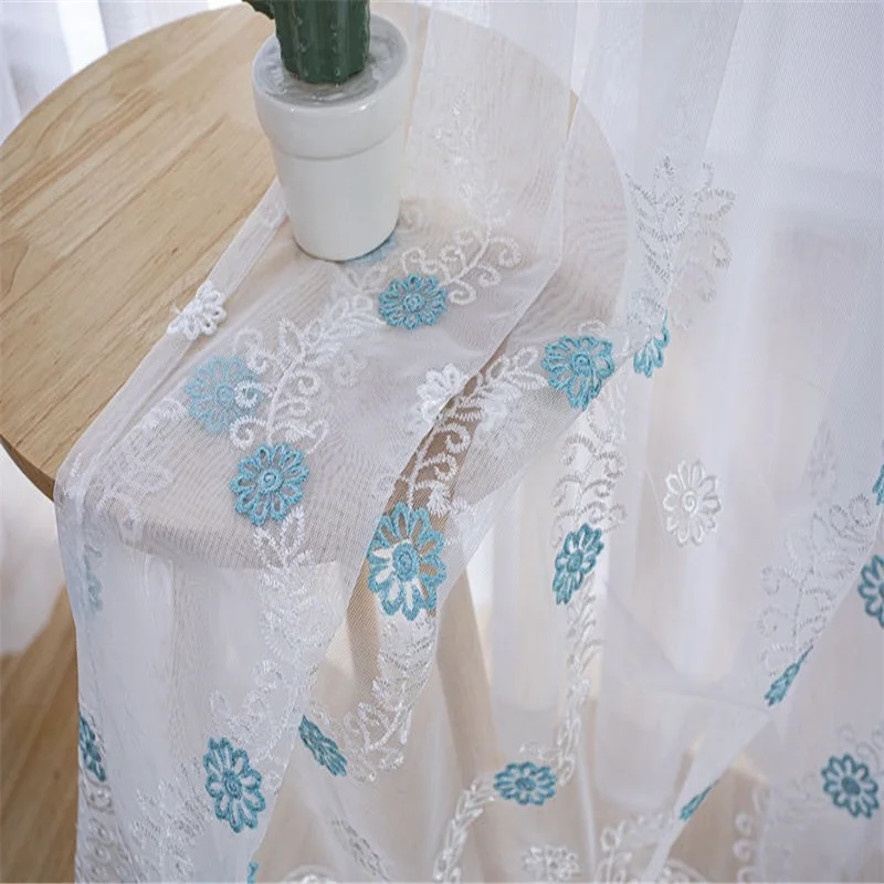 Белые вышитые прозрачные шторы для гостиной, тюлевые шторы с синим ...