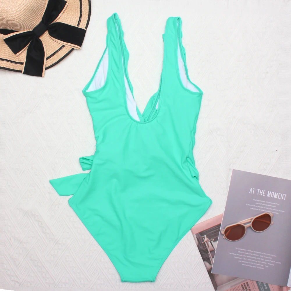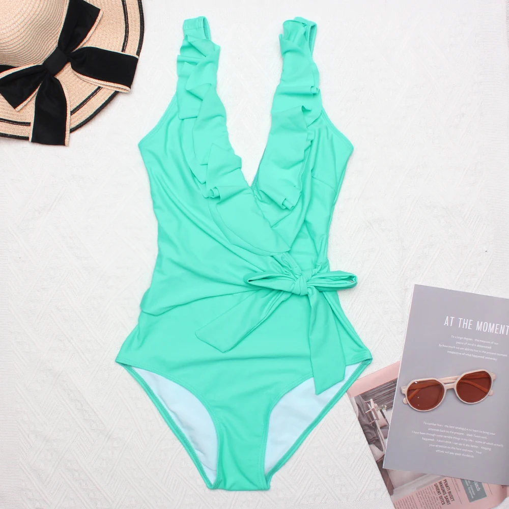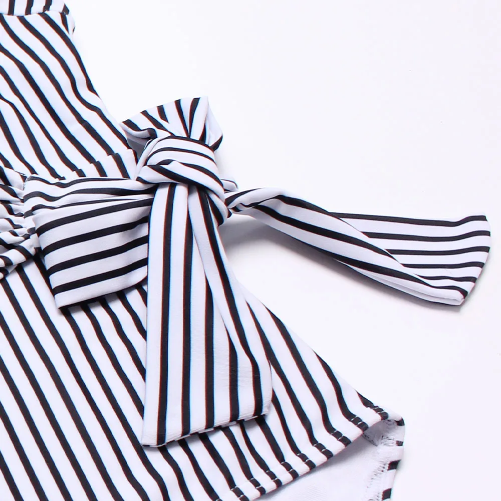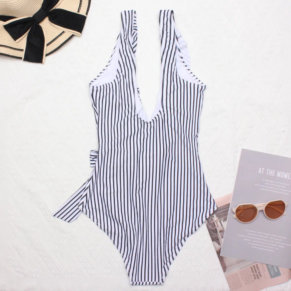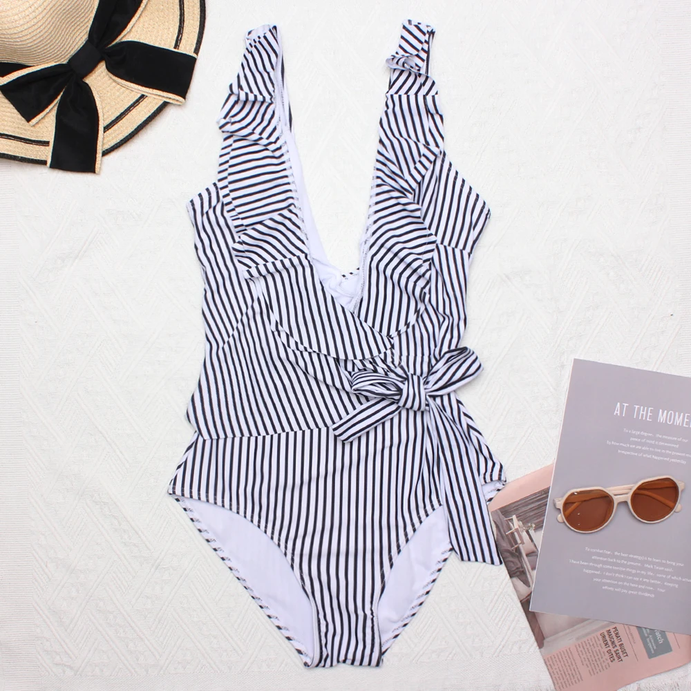 Женский слитный купальник с V-образным вырезом и оборками, бандажный купальник, пляжный купальный костюм, винтажный боди, монокини в полоску