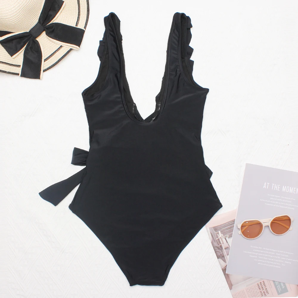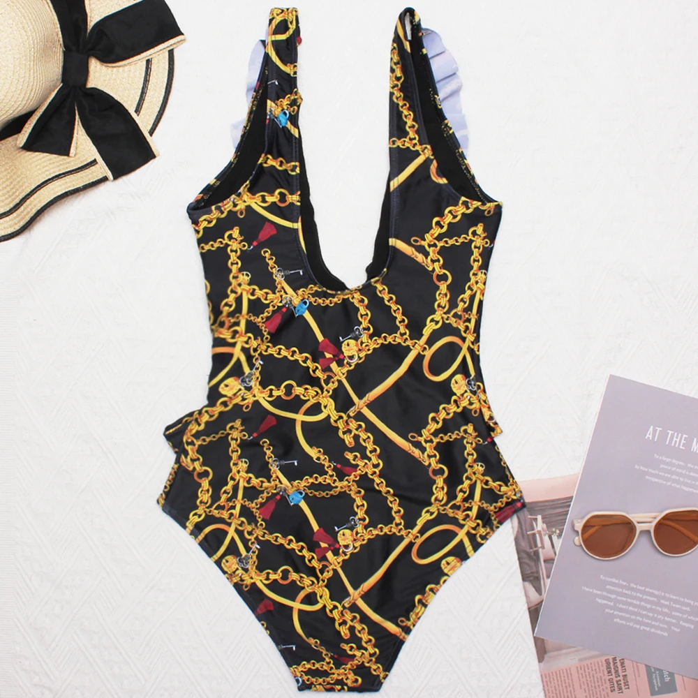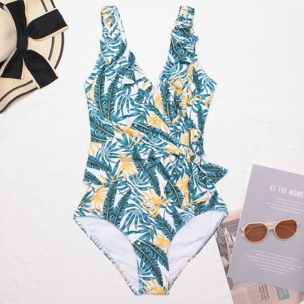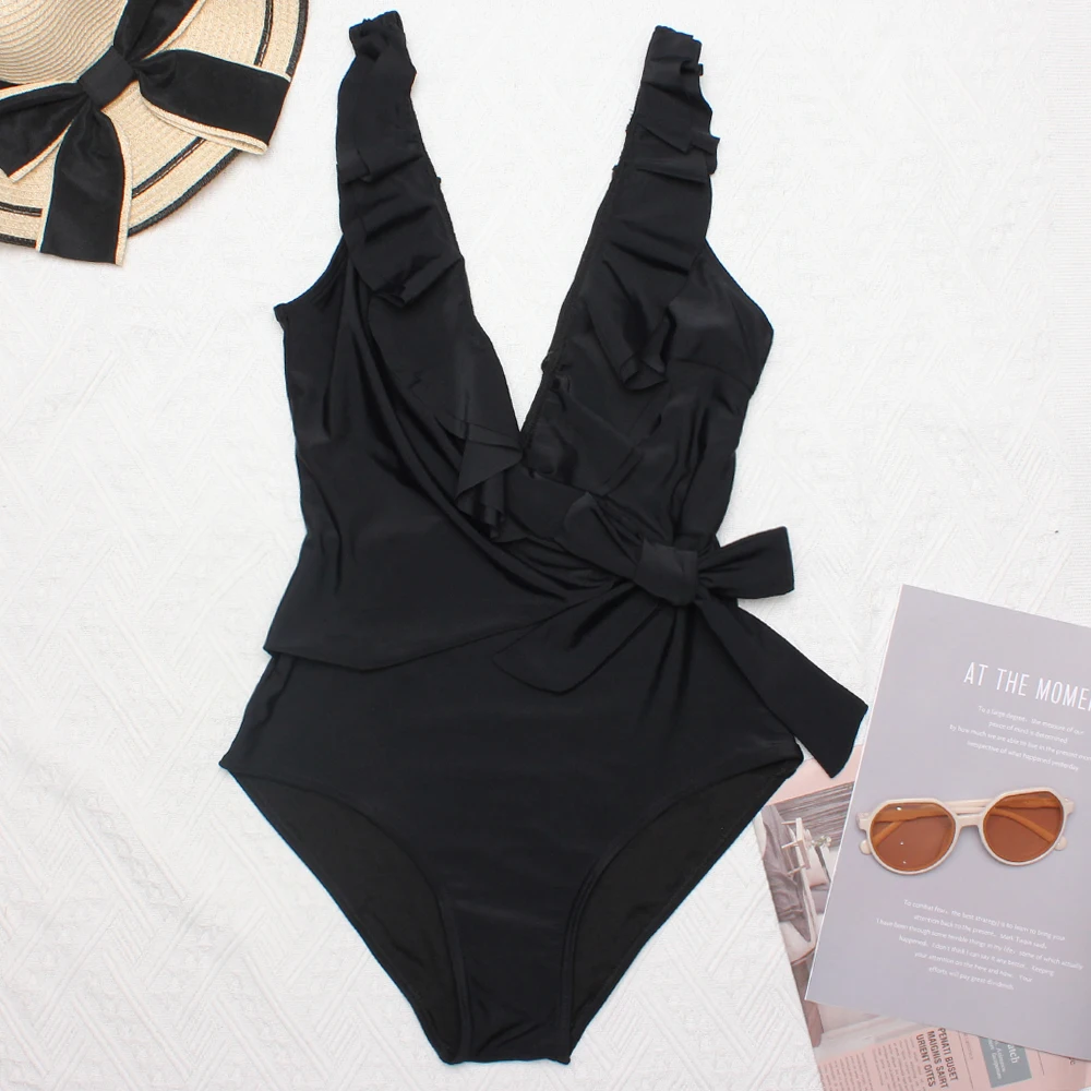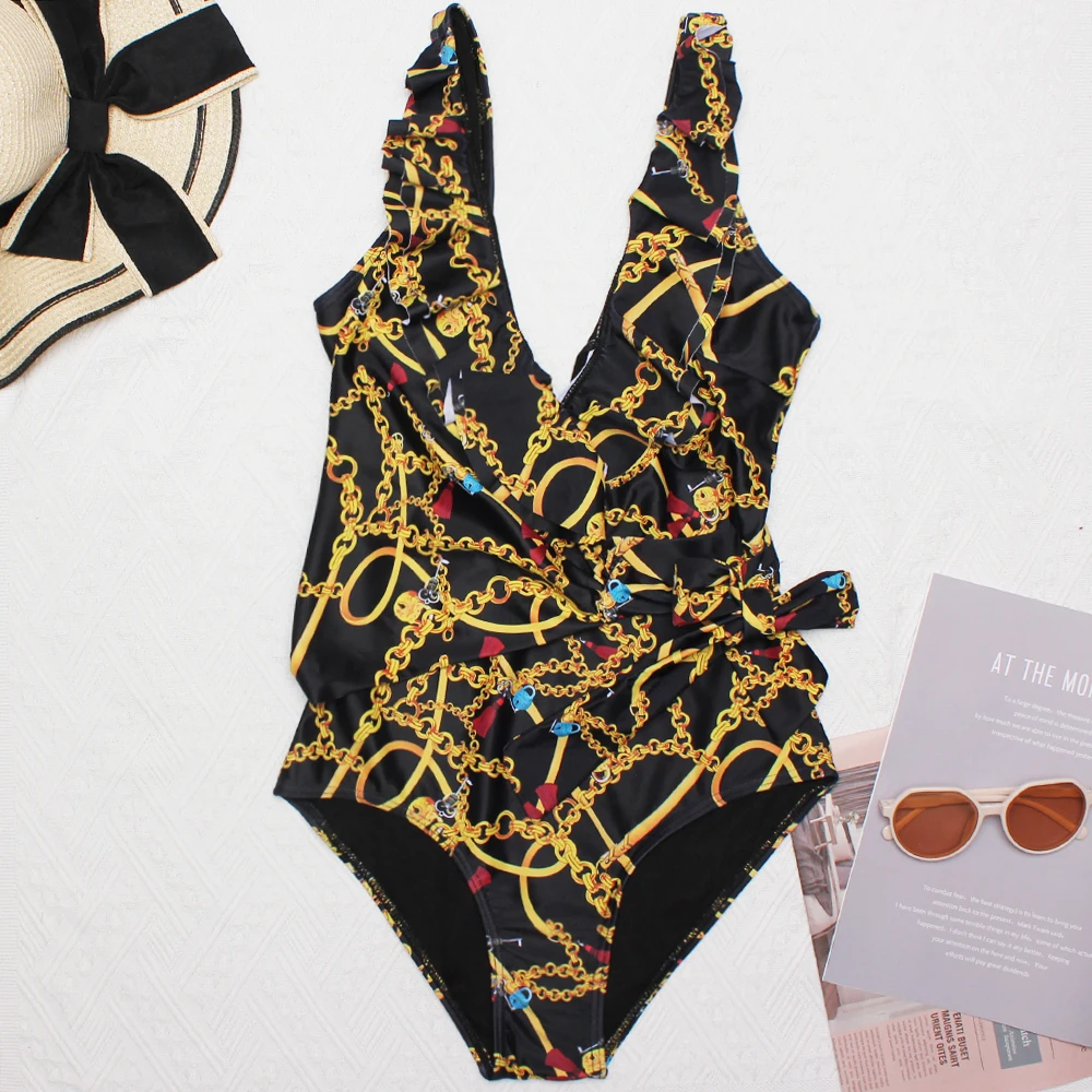 Женский слитный купальник с V-образным вырезом и оборками, бандажный купальник, пляжный купальный костюм, винтажный боди, монокини в полоску