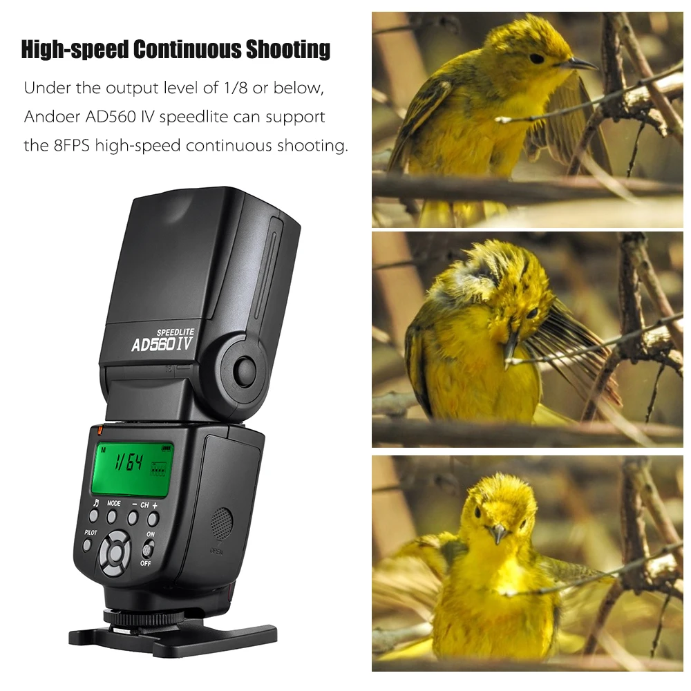 Особенности:GN50 @ ISO 100: Andoer новый большой направляющий номер ручной speedlite, поддержка M режимов.Высокочувствительный беспроводной датчик срабатывания делает режим S можно использовать в наружной среде и беспроводное расстояние срабатыванияОколо 100 м.Поддерживает функцию звуковой подсказки, различные звуки указывают на рабочие ситуации и помогают вам фокусироваться на съемке (Примечание: звук может быть закрыт).С портом ПК, вы можете сделать вспышку синхронно, подключив к порту ПК.Супер скорость зарядки утилизируется: зарядка занимает всего 3 секунды после полной выходной мощности. Даже без новых аккумуляторов, вы можете получить скорость суперзарядки, которая требуется всего 4 ~ 5 секунд.Высокоскоростная непрерывная съемка: при уровне выхода 1/8 или ниже она может поддерживать высокоскоростную непрерывную съемку 8 кадров в секунду.Экономия автоматической настройки: speedlite Andoer AD560 IV может автоматически сохранять настройки тока.Поставляется с дистанционным триггером вспышки, который можно управлять одной или несколькими вспышками одновременно. Характеристики:Бренд: AndoerМодель: AD-560 IVКонструкция цепи: изолированный биполярный транзистор (IGBT)Руководство №: 50 (ISO 100)Режим: режим M flash, режим S flash, беспроводной режимВертикальный угол вращения: -7 ~ 90 градусовУгол горизонтального вращения: 0 ~ 270 градусовИсточник питания Speedlite: 4 батарейки типа АА(Не входит в комплект)Триггер питания: 1 * CR2 литиевая батарея(Не входит в комплект)Время освещения: 100 ~ 1500 раз (при использовании щелочной батареи АА)Время рециркуляции: прибл. 3s (используется Щелочная ячейка @ AA)Цветовая температура: 5600kВремя вспышки: 1/200s ~ 1/20000sУправление вспышкой: 8 уровней управления выходом (1/128 ~ 1/1), 29 уровней тонкой настройкиВнешний интерфейс: горячий башмак, порт ПКБеспроводная дистанция запуска:Около 100 мВес изделия (без батареи): 320 г/11,3 унцийПосылка Размеры: 26*10,5*8,5 см/10,2*4,1 * 3.3inВес посылка: 530 г/1,2 фунта Примечание:Батарейки в комплект не входят.Эта speedlite является подчиненным блоком, и она не может использоваться в качестве главного блока для запуска других speedlite. Speedlite не совместим с CANON 1500D,3000D,200D II, 2000D, 4000D, Rebel T7, Rebel, KISS X90. Посылка:1 * Speedlite1 * триггер1 * защитный мешок1 * Мини-подставка1 * Руководство пользователя (на английском языке)