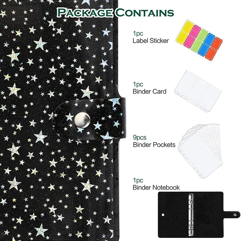 [ПВХ бюджетный переплет] симпатичный A6 бюджетный переплет чехол с черными звездами. Простая операция, при которой нажмите оба конца, чтобы открыть кольцо свободного листа. Прочный чехол с защелкой для надежного закрытия. (Будьте внимательны при нажатии на кольцо, чтобы закрыть, не повредите руки)[Чехол и карманы A6] качественный ПВХ не легко складывается, как бумага. Карманы a6 имеют мягкость и водонепроницаемость. Прозрачный материал обеспечивает четкий обзор для быстрой и легкой идентификации.[Многофункциональная] папка на молнии, карманы, хранят для баланса с наличные конверты, купоны, карты, деньги и другие мелкие предметы. Самоклеящиеся записываемые этикетки помогают a6 binder управлять и сортировать.[Посылка включает в себя] вы можете получить 6-ring A6 переплет для ноутбука для организации, 9 шт 6-hole A6 карманы для переплета и карта для переплета, с этикеткой наклейка для управления легко.Цвет: черный/серебристыйМатериал: ПВХПосылка:Чехол-книжка из ПВХ (1 шт.)9 x карманы1 x карта-Связыватель1 наклейка на этикеткуТолько вышеуказанная посылка, другие товары не включены.Примечание: светильник и различные дисплеи могут привести к тому, что цвет товара на картинке немного отличается от реального. Допускается погрешность в измерениях +/- 1-3 см.