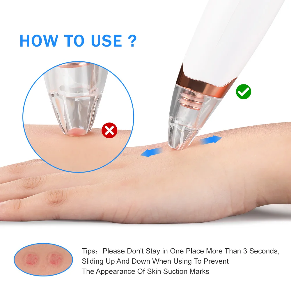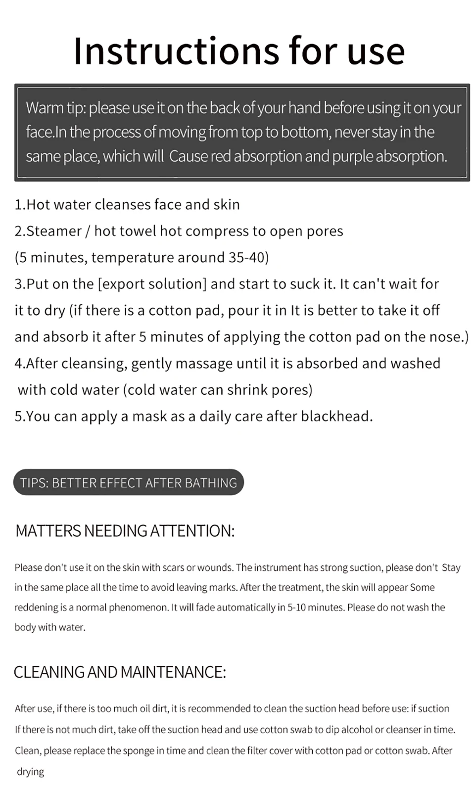 Большая присоска с круглым отверстием: сила всасывания подходит для упрямых черных точек и прыщей в области Т-зоны, сила всасывания должна быть перемещена во время всасывания. Хрупкая, тонкая кожа с осторожностью. -Один раз в неделю, один раз в часах или около того, в зависимости от состояния кожи.