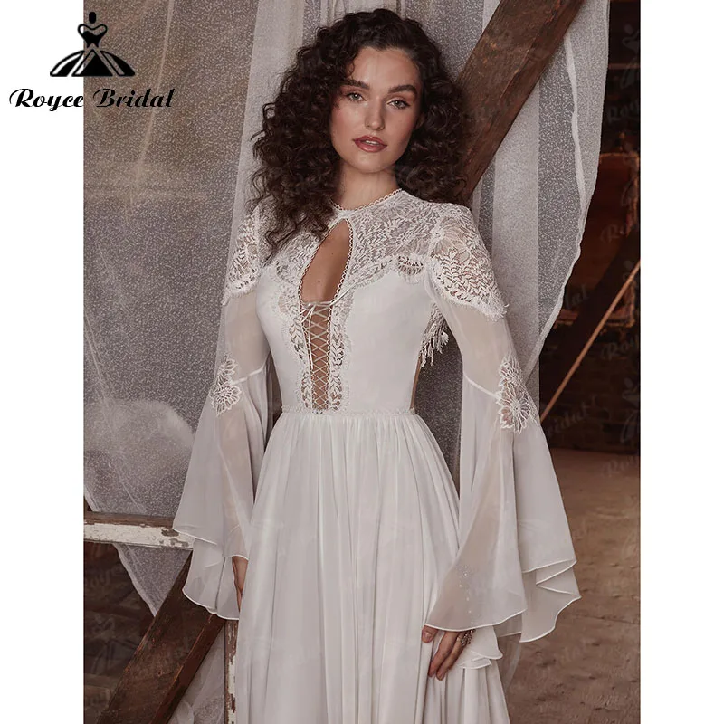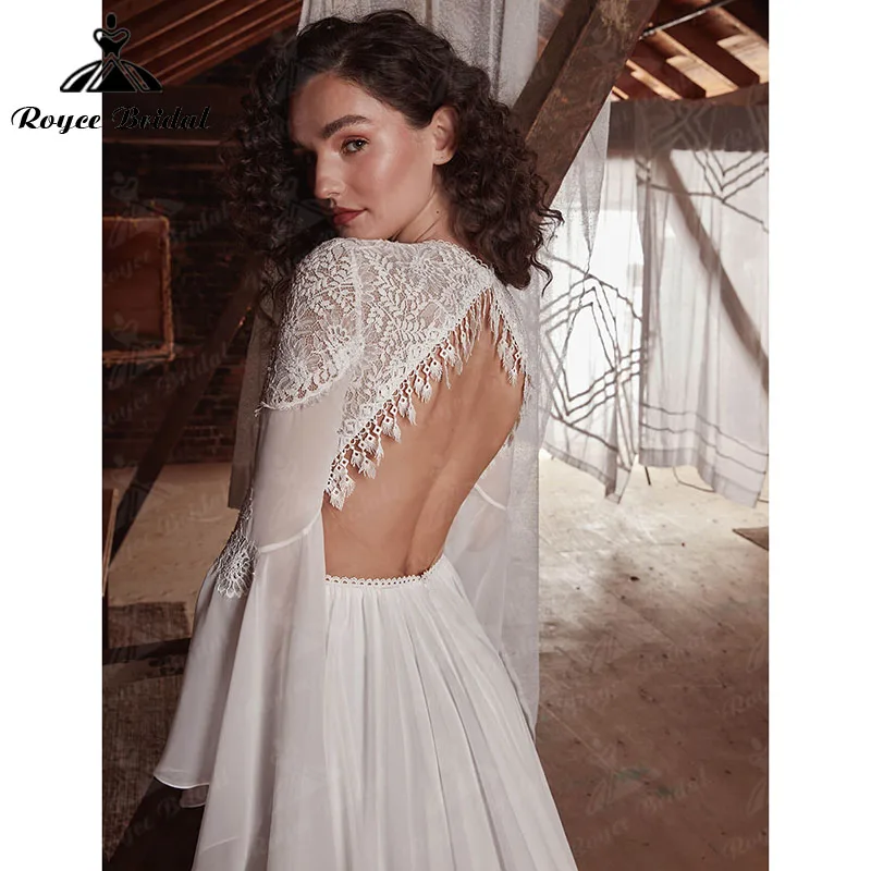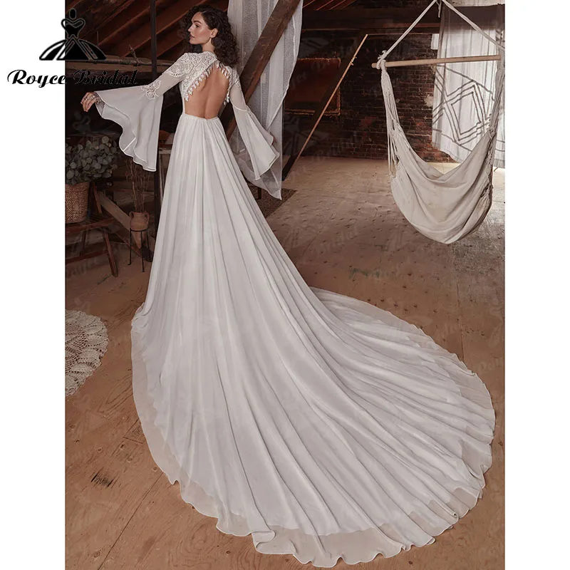 Женское свадебное платье А-силуэта в богемном стиле, Пляжное шифоновое платье с глубоким V-образным вырезом, открытой спиной и длинными расклешенными рукавами, со шлейфом, 2022