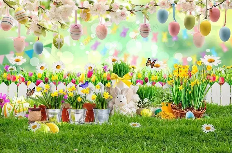 Весенний Пасхальный фон кролик фотография Фон Луг цветок Яйцо корзина цветной Небольшой баннер белый забор фон