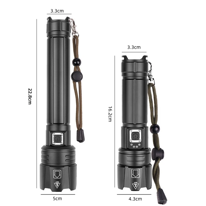 Светильник источник: XHP90.2 внешний вид цвет: черный Размеры: 22,9 см × 5 см × 3,2 см Мощность Источник: 2x26650 батареи или 2 х 18650 батареи светильник ing времени: 2-8 часов способ зарядки: USB диапазон прямой зарядки: от 200 до 500 метров Уровень водонепроницаемости: IPX-6 Вес нетто: 265 г (без аккумулятора) Материал корпуса: Зум из алюминиевого сплава: Регулируемый фокус Материал: алюминиевый сплав 3 режима переключения: 100%-50%-вспышка