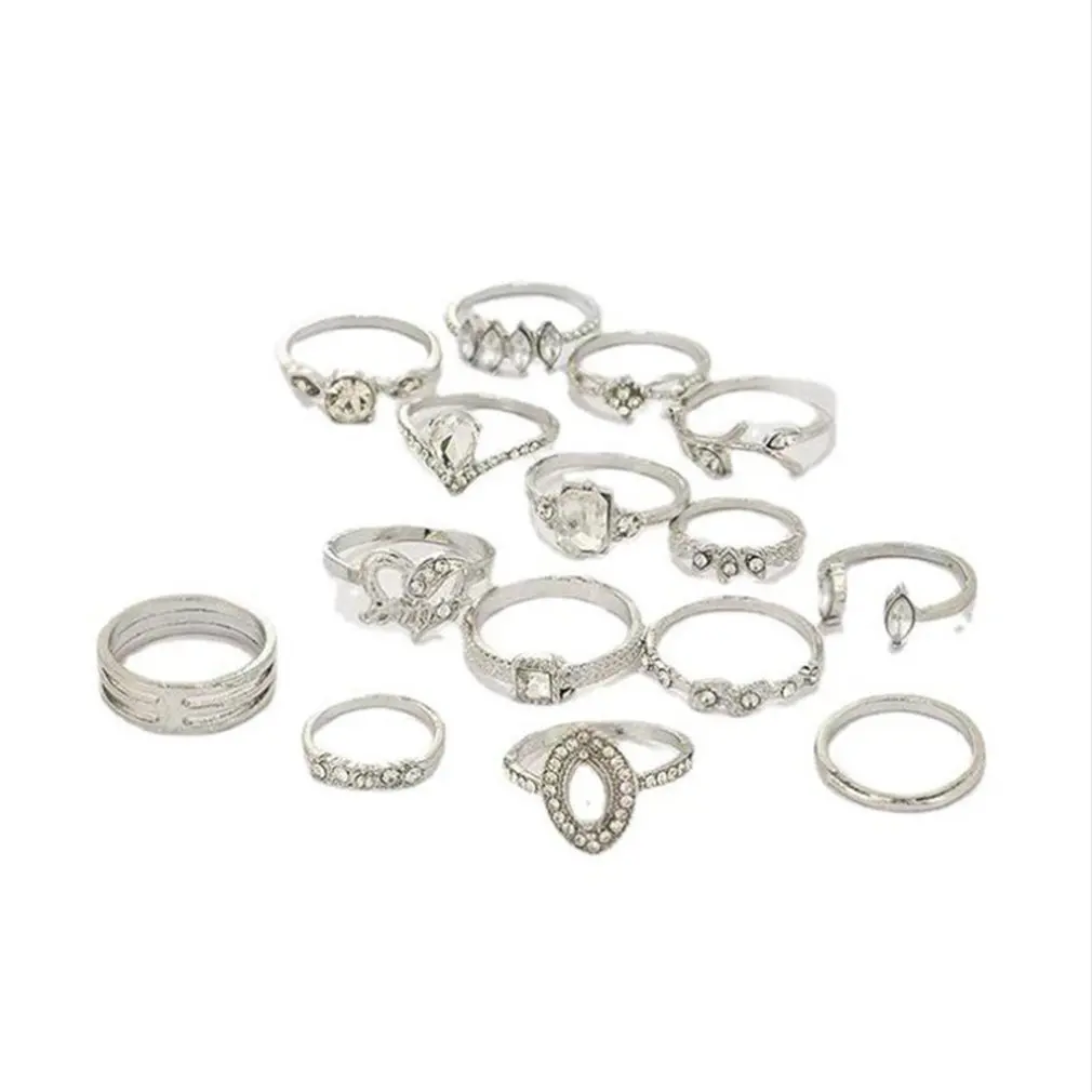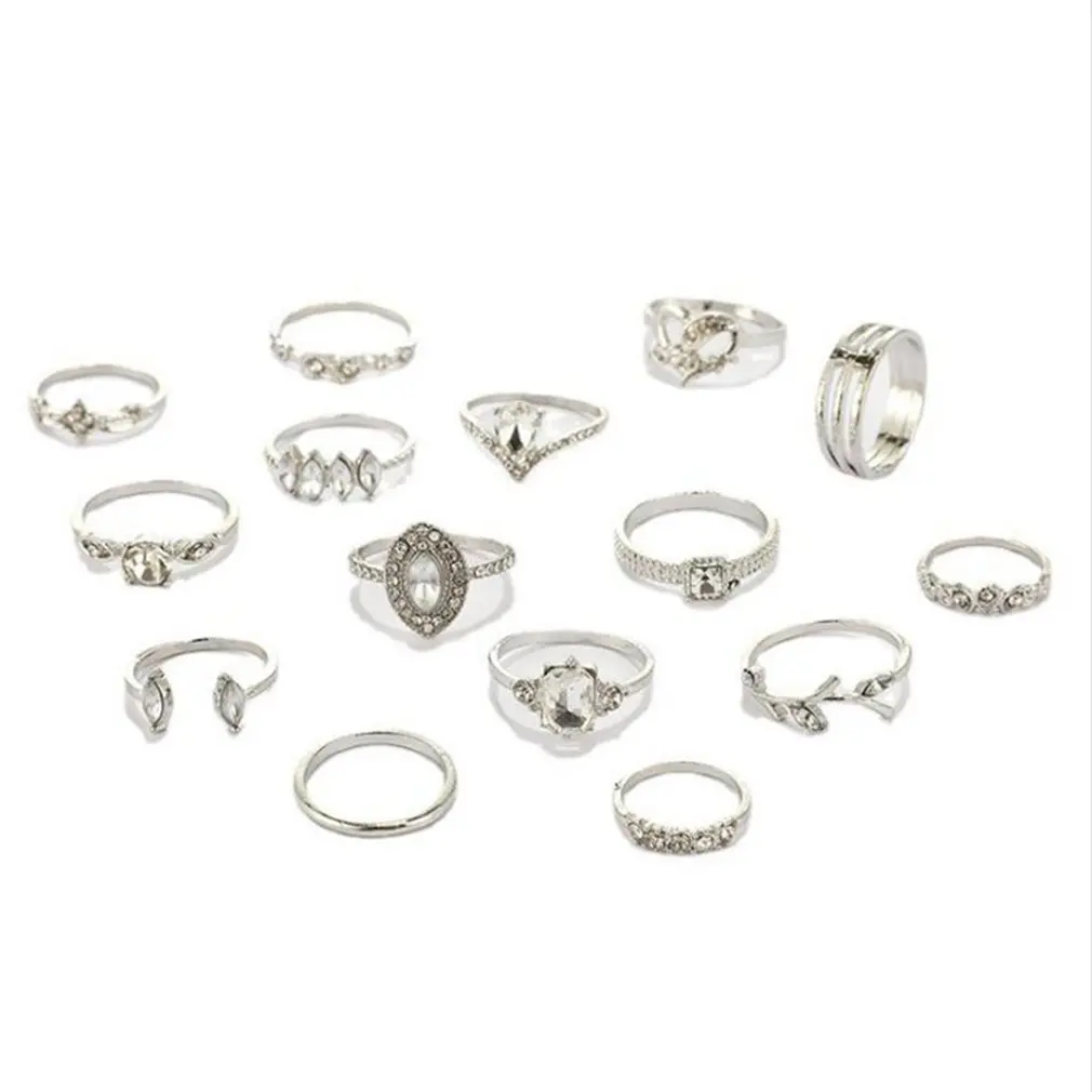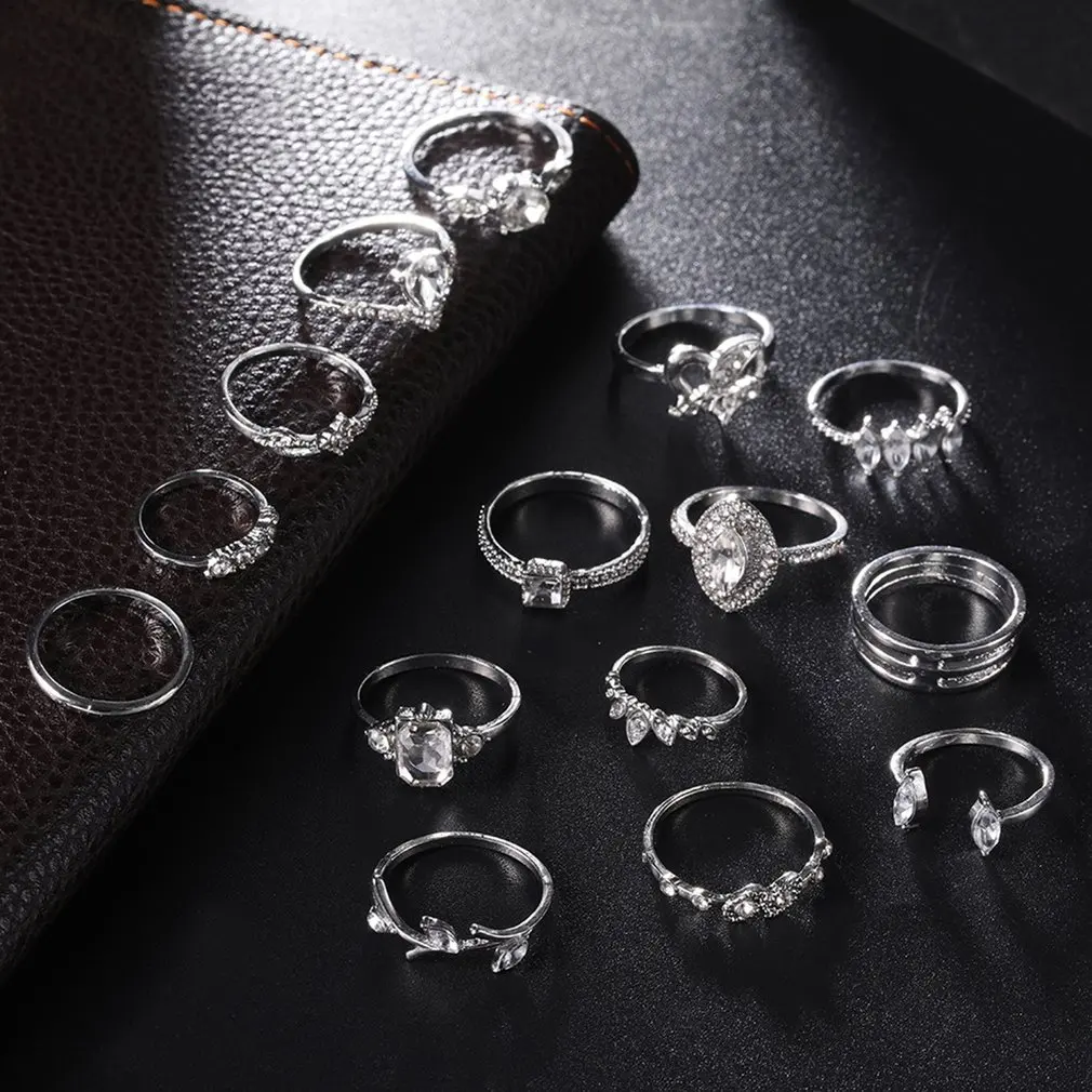 Женское кольцо на палец, 15 шт., богемное кольцо с кристаллами и листьями, кольцо с полым сердцем, набор для женщин, кольцо на палец, кольца для свадебной вечеринки, подарок