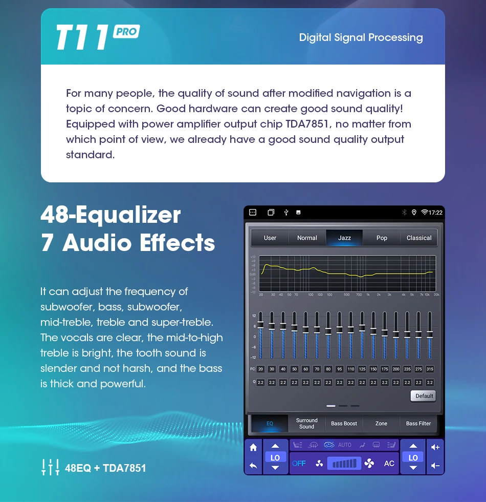 Передние и задние сабвуферы могут самостоятельно усиливать выход, напрямую блокировать высокие частоты, распределять мощность на колонки и поддерживать выход сабвуфера. Даже если вы не меняете Оригинальное автомобильное аудио, вы можете четко почувствовать, что бас более толстый и мощный.