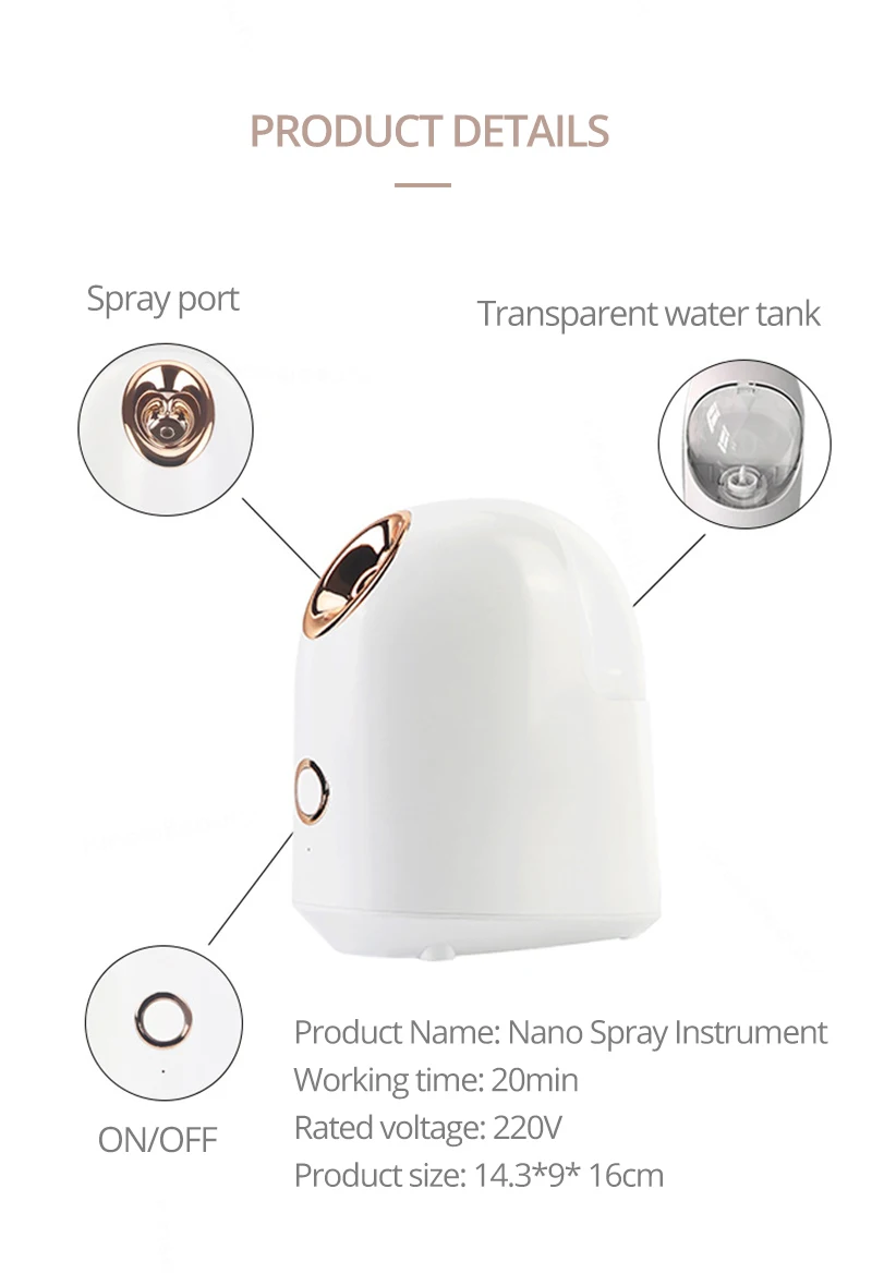 Поры засорены натуральными маслами и внешними загрязнителями, что приводит к Угрем, пятнам, акне и тусклой коже. Нано-отпариватель для лица наносит постоянный 40 ℃ увлажняющий нагрев на кожу, который открывает поры и вытесняет мусор, позволяя глубже, лучше очистить. Кроме того, повышение температуры кожи и эпидермиса позволяет улучшить кровообращение. Это приводит к увеличению потока кислорода на очищенную кожу, которая оживляет клетки кожи с помощью необходимых витаминов и минералов. Для достижения наилучших результатов мы рекомендуем применять сыворотки, чистящие средства и увлажняющие средства непосредственно после обработки кожи с помощью Нано-отпаривателя для лица, так как это происходит, когда кожа грунтована для максимального очищения и поглощения!