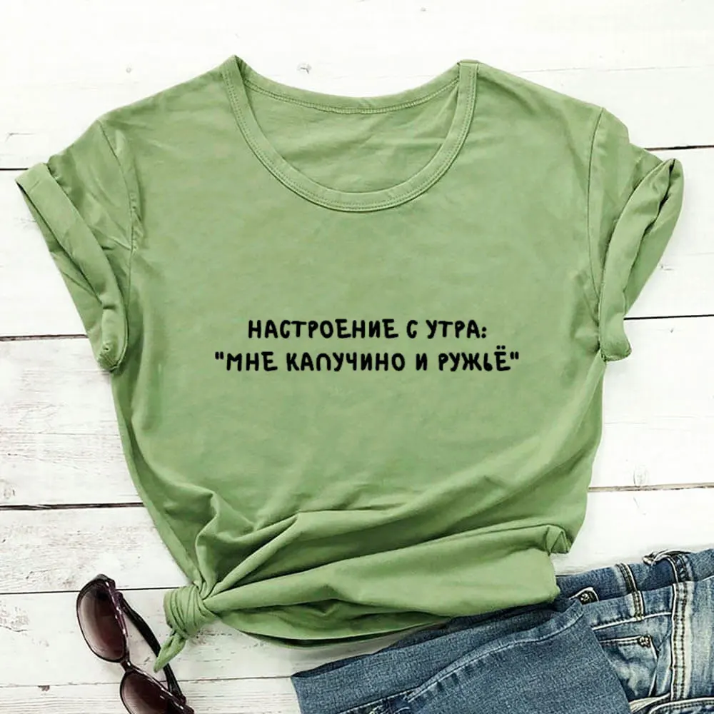 Настроение с утра: "мне капучино и ружье" русская буква печать новое поступление женская прикольная летняя хлопковая футболка с коротким рукавом майка женская футболка