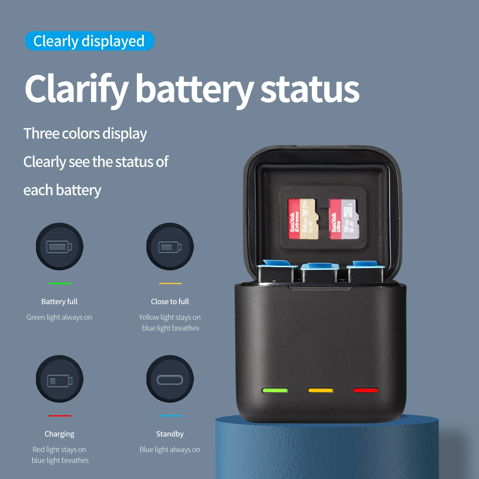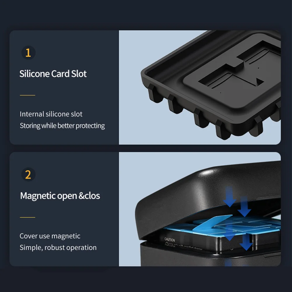 1,1750 mAh capactity, терка, чем Оригинальная батарея capactity2. До 112 мин времени съемки на одной батарее (время использования отличается в разных режимах).3.100% идеально подходит для GoPro Hero 9,GoPro Hero 10, без всплывающих окон.4. Зарядное устройство так же удобно на ощупь, как и детская кожа.5. Девять защиты, используйте с уверенностью, аккумулятор и зарядное устройство безопасны.6. Три батареи во время зарядки и хранения, вмещает до двух tf-карт и трех батарей.7.2.4 большого тока, Полная зарядка занимает всего лишь 2,5 h.8. Силиконовый слот для карт, сохраняя при этом лучшую защиту.9. Магнитное открытие и закрытие, покрытие использует магнитное, простое, надежное управление.10. Противоскользящий силиконовый коврик, используйте в нижней части, чтобы избежать падения, больше безопасности.11. Интерфейс Type-c, поддержка передних и обратных вставок, не требуется адаптация кабелей.12. Внешний аккумулятор, ноутбук, автомобильное зарядное устройство могут заряжать его.13. Четко отображенный, уточняющий состояние батареи, постоянно включается зеленый светильник, близкий к полноте желтый светильник остается на синем светильник дышит, Зарядка красный светильник остается на синем светильник дышит, В режиме ожидания всегда включен синий светильник.14. Легко помещается в рюкзак, не занимает много места.