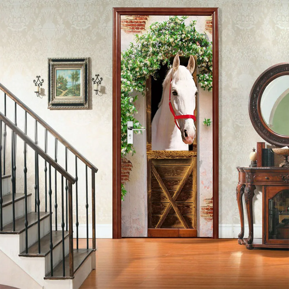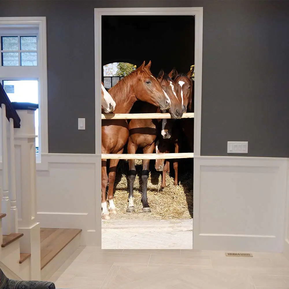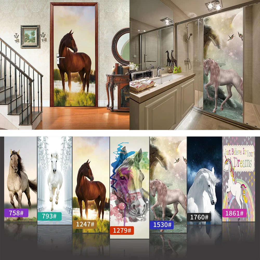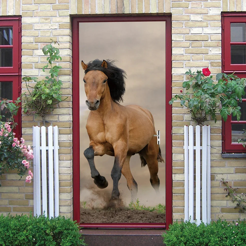 Настенная дверь с постером лошади, 3D наклейка, спальня, ванная комната, гостиная, самоклеящиеся дверные наклейки, ПВХ водонепроницаемые съемные обои
