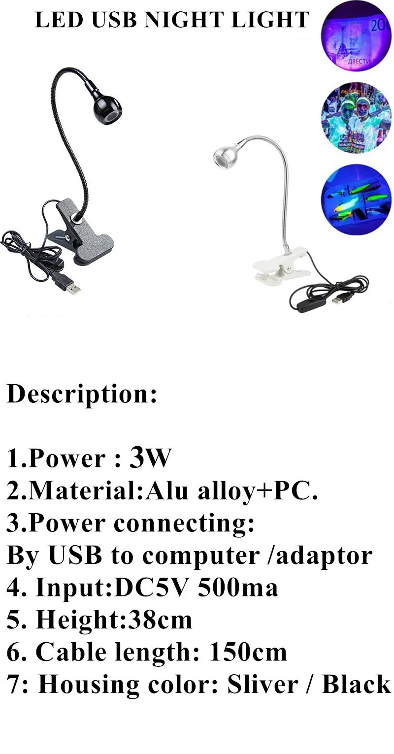 1. Мощность: 3 Вт2. Материал: сплав Alu + PC.3. Подключение питания:От USBК компьютеру/адаптеру4. Вход: DC3-5V 500 мА5. Высота: 38 см6. Длина кабеля: около 150 см7: Цвет корпуса:Серебристый/черный