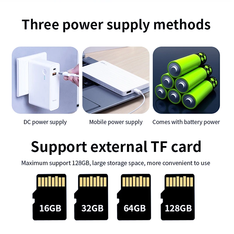 Поддержка tf-карты, USB встроенный, встроенный литиевый аккумулятор, три способа питания