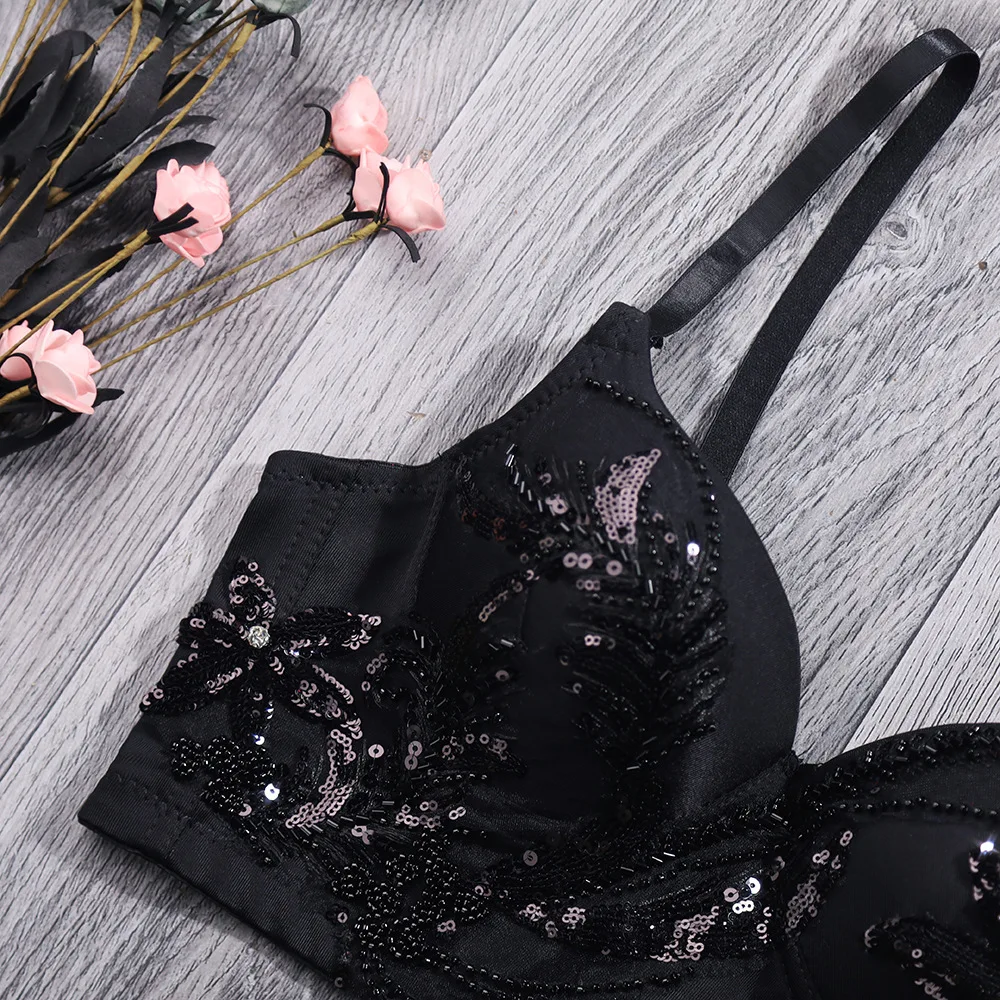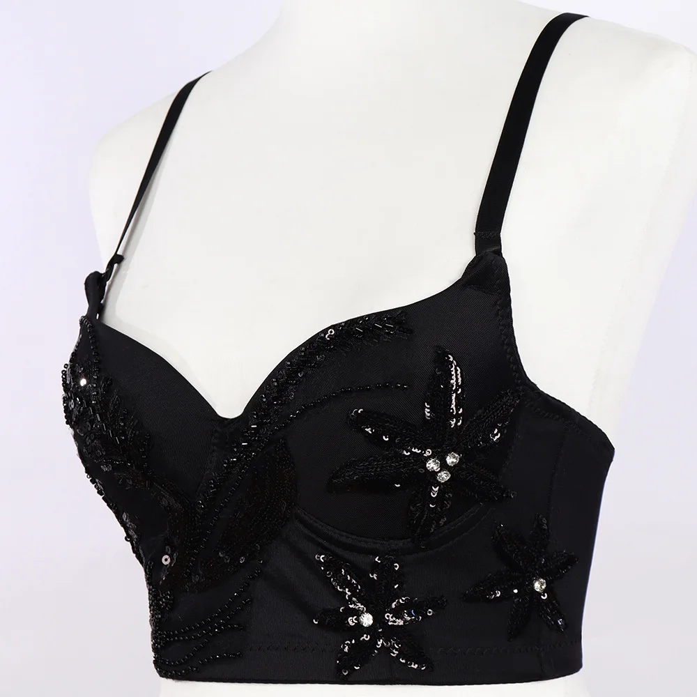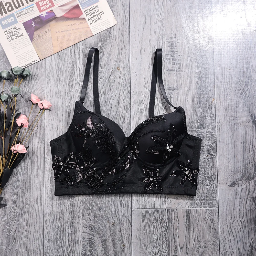 Сексуальный черный бюстгальтер с блестками, майка-топ с аппликацией, Женский корсет, хлопковое нижнее белье со стальными кольцами, майка на бретелях для вечевечерние НКИ, клуба, топы