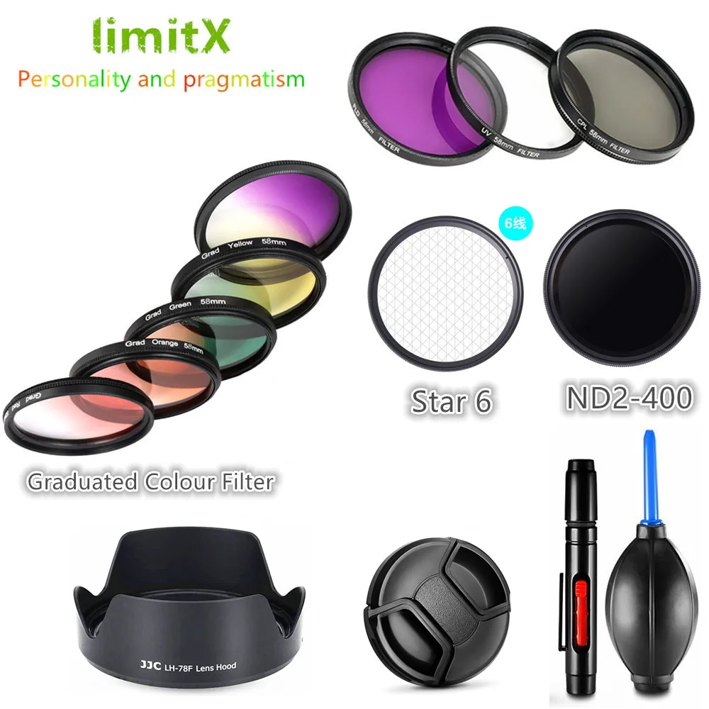 1x УФ-фильтр, 1x CPL фильтр, 1x FLD фильтр, 1x ND2-400 фильтр, 1x Star 6 фильтр, 1x Градуированный красный, 1x Градуированный желтый, 1x Градуированный зеленый, 1x Градуированный фиолетовый, 1 Градуированный оранжевый фильтр, 1 EW-78F бленда для объектива, 1 крышка для объектива, 1 ручка для очистки, 1 воздушный насос, 1x чехол для фильтра, 1x салфетка для очистки