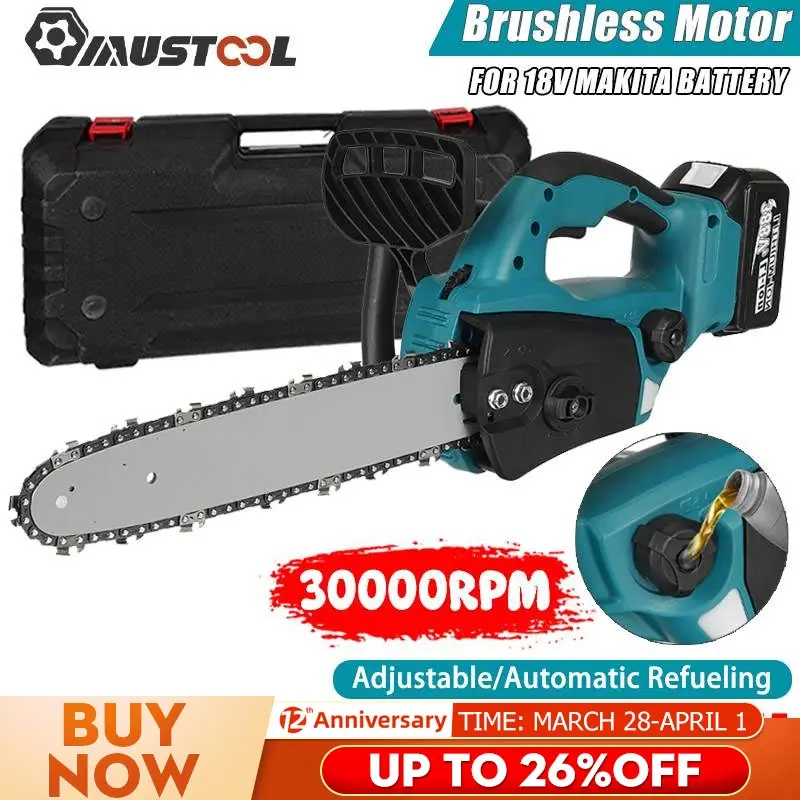 Бесщеточная электрическая бензопила mustools, 4000 Вт, 12 дюймов, автоматическая заправка, для сада, деревообработки, электроинструмент для Makita, батарея 18 в