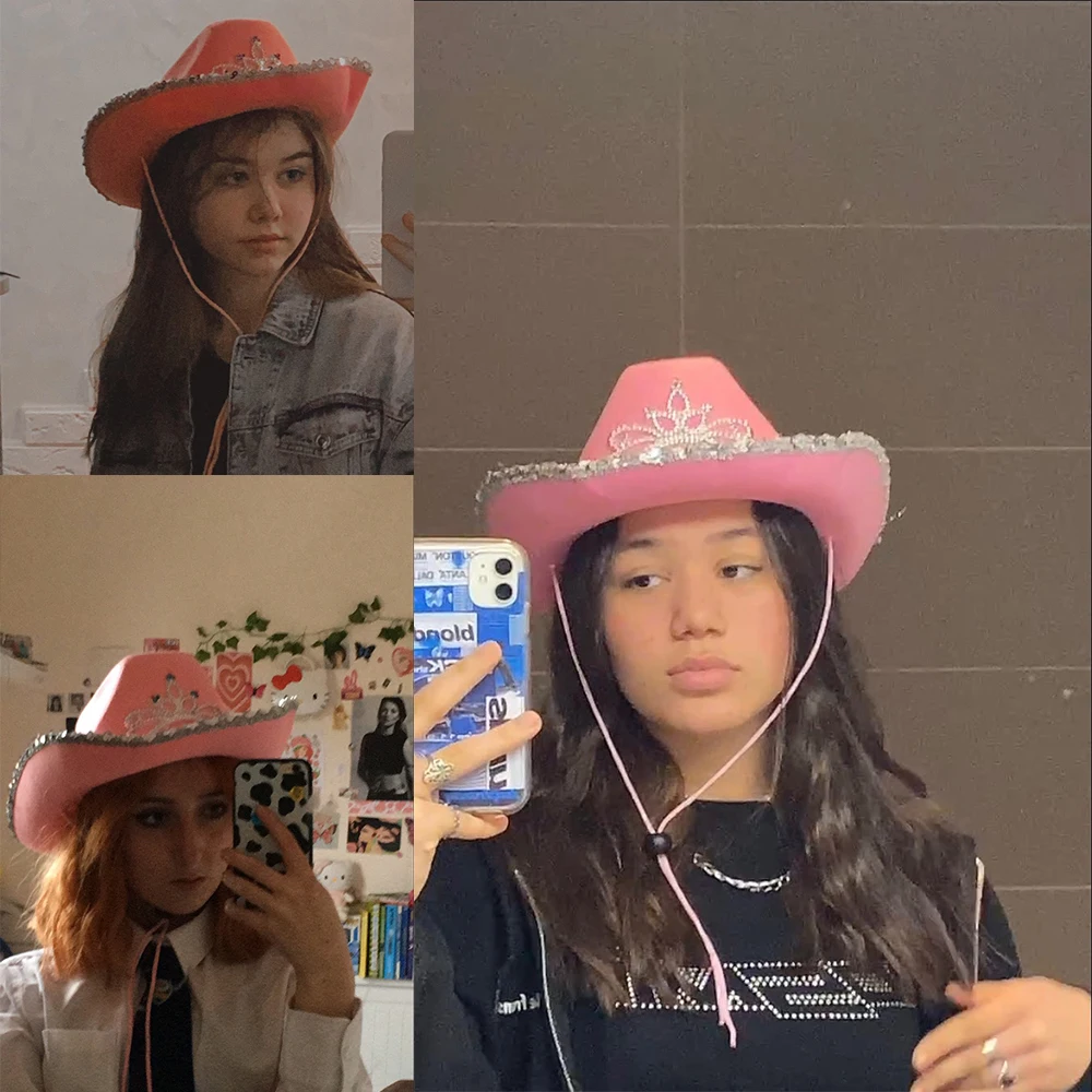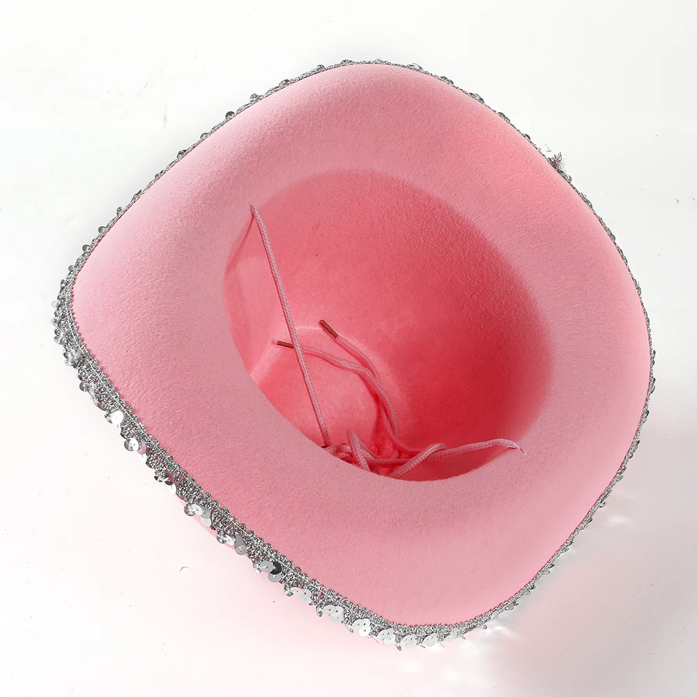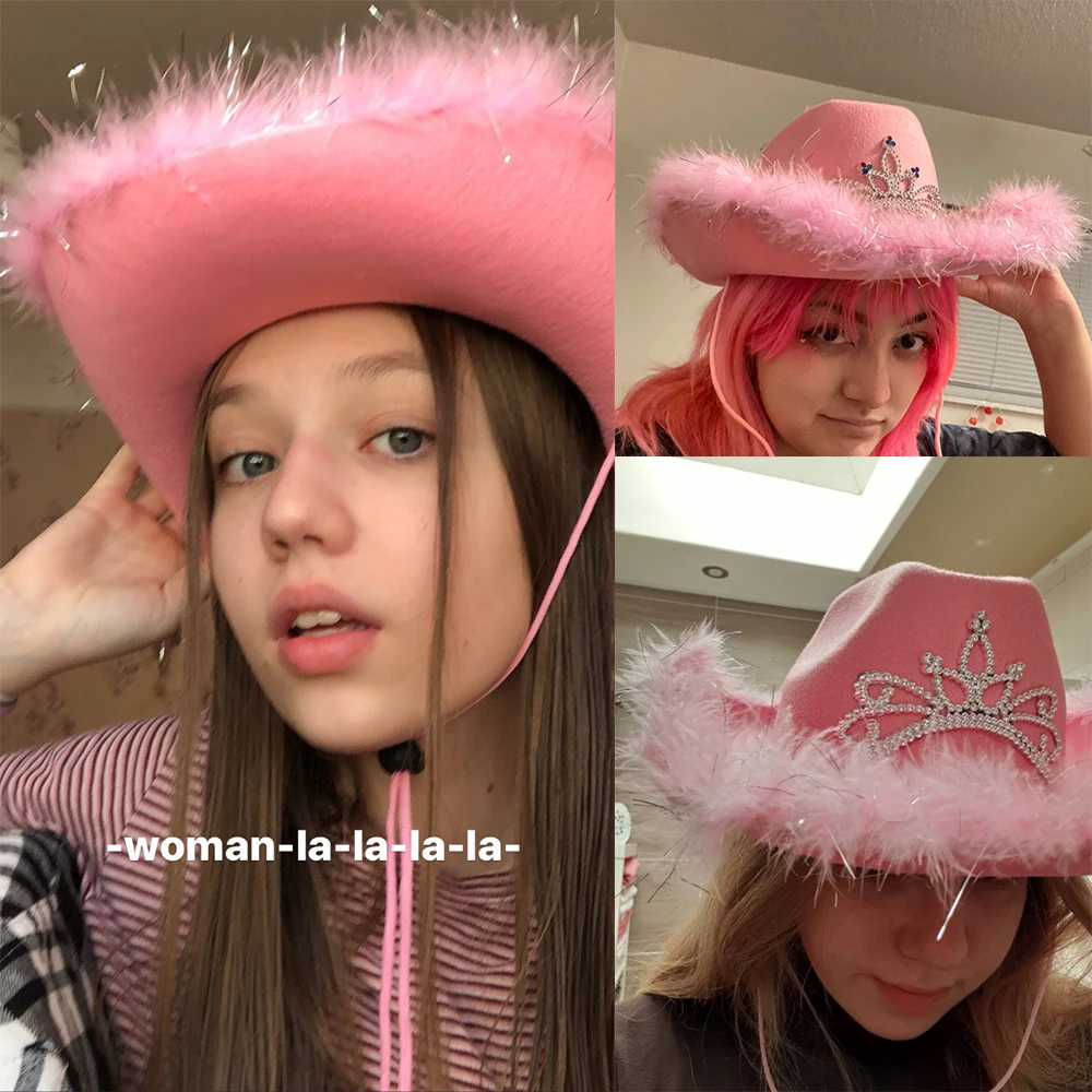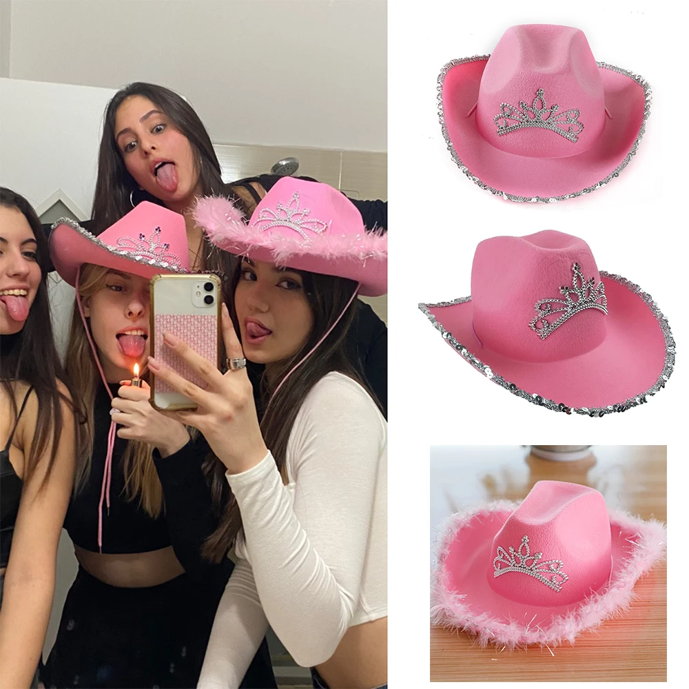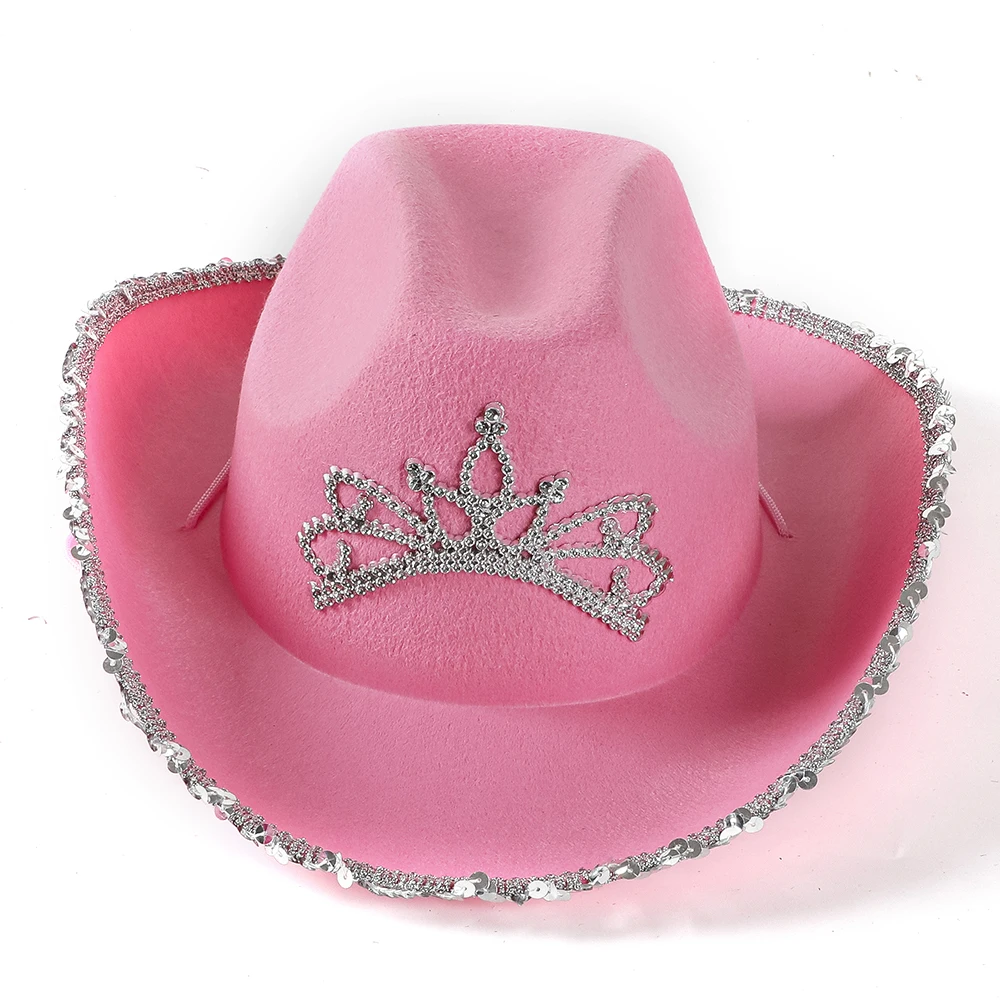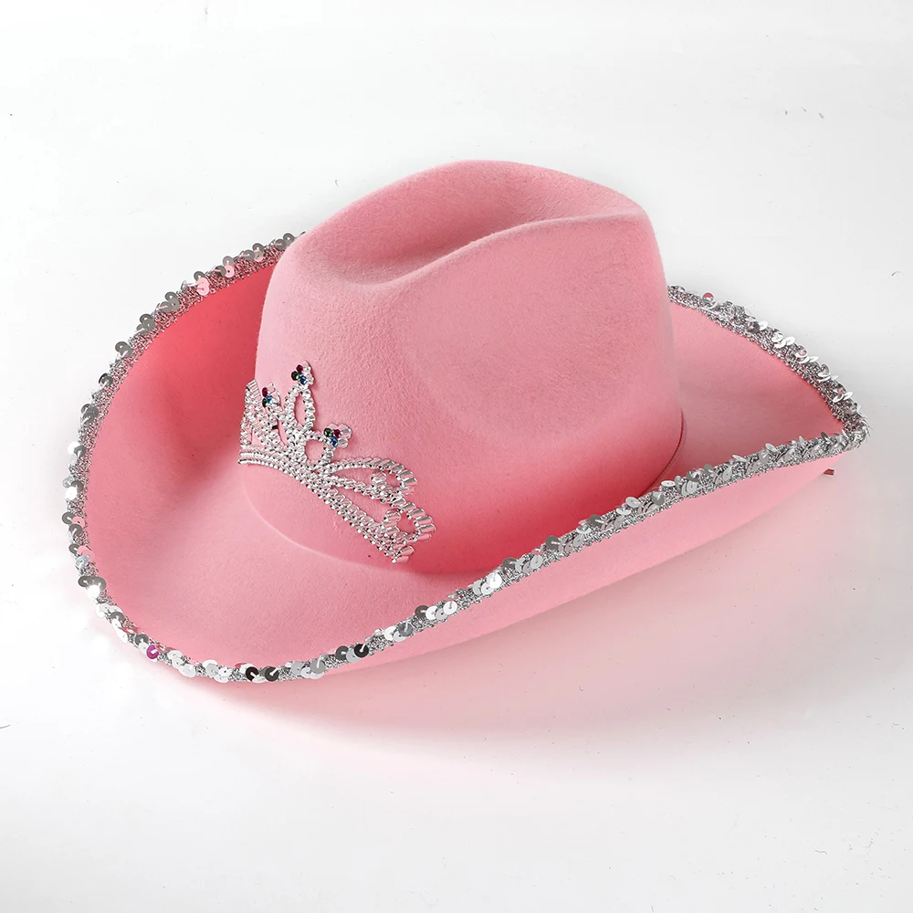 Ковбойская шляпа в западном стиле, розовая Женская модная кепка для вечерние с широкими полями и блестками, Декоративная Корона, тиара, шляпа-ковбойская