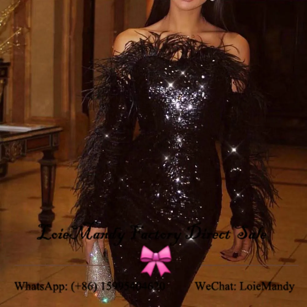 Сверкающее черное коктейльное платье с блестками и перьями 2022 Сексуальные вечерние платья с длинным рукавом с открытыми плечами Короткие Выпускные платья