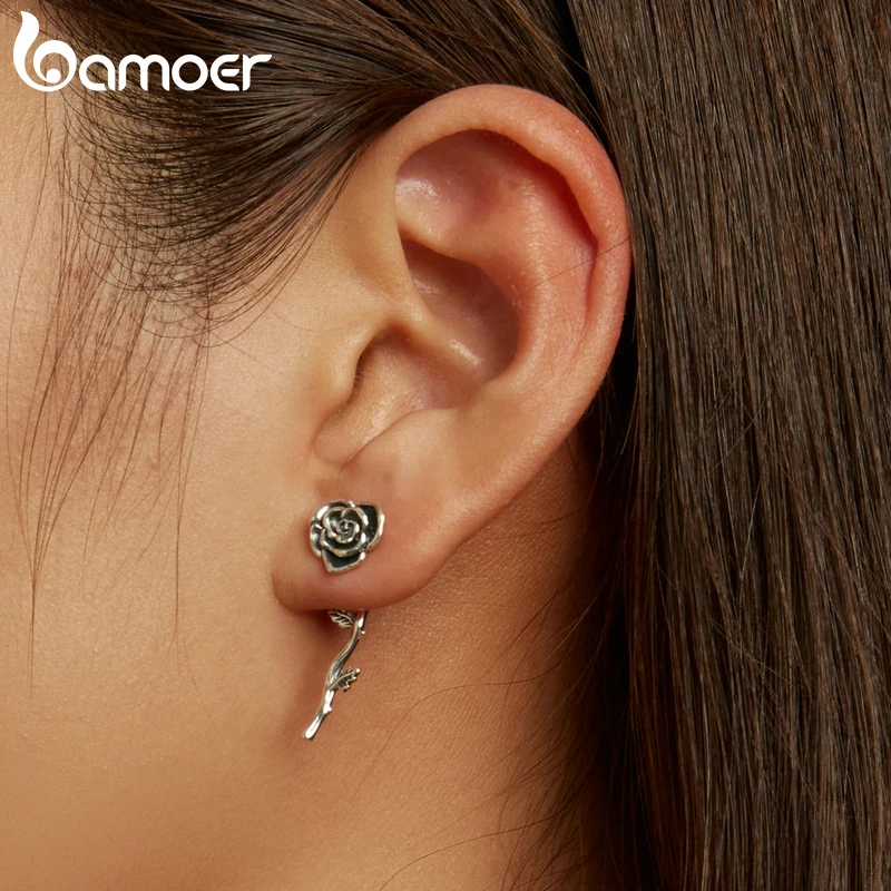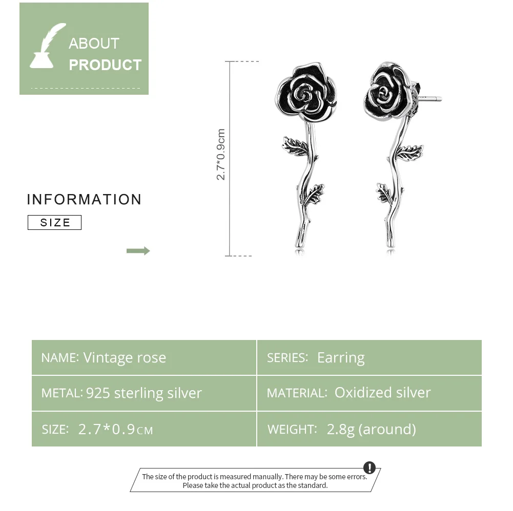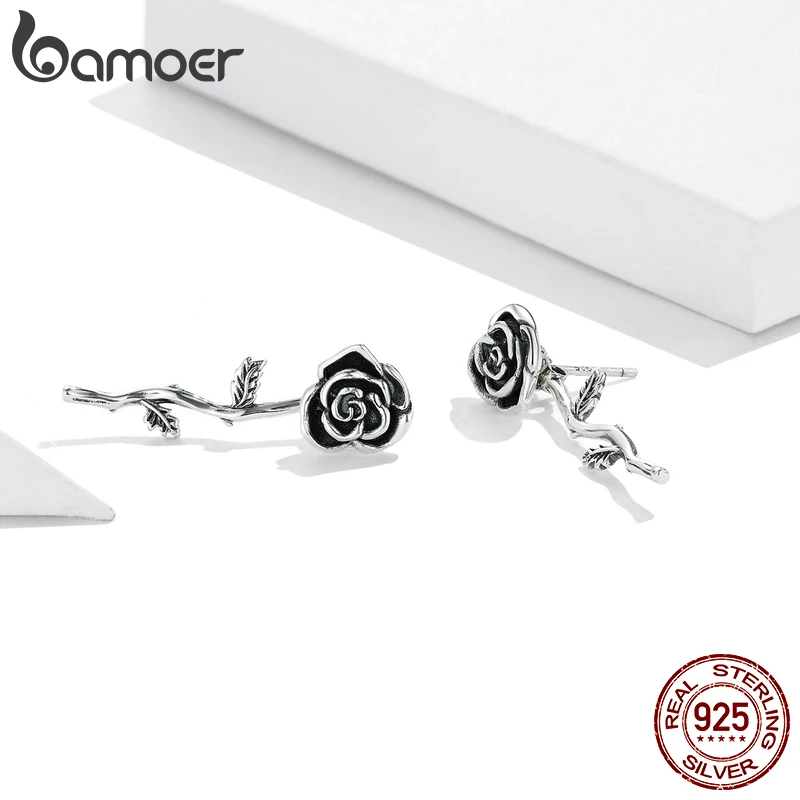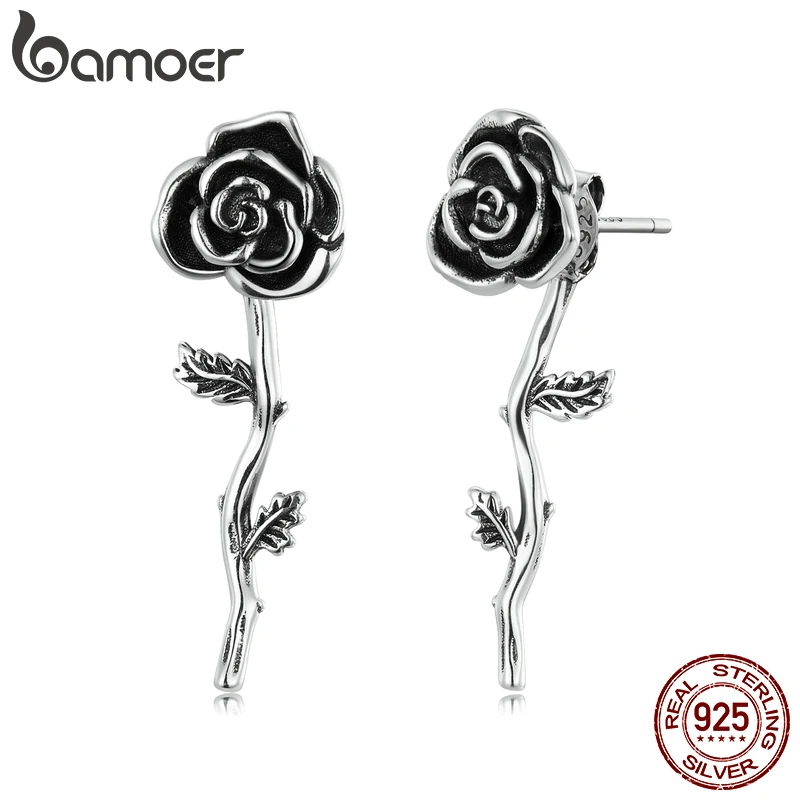 Женские винтажные серьги-гвоздики Bamoer из стерлингового серебра 925 пробы в стиле ретро с черными розами для девушек, изысканные ювелирные украшения, подарок с изящными ушами