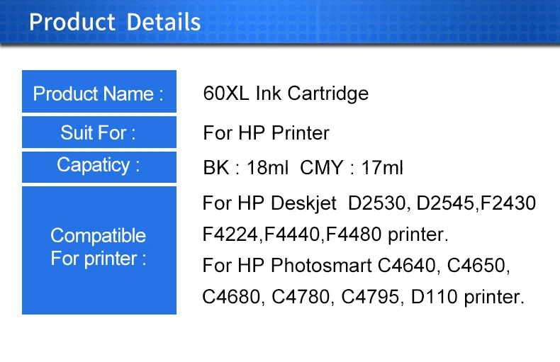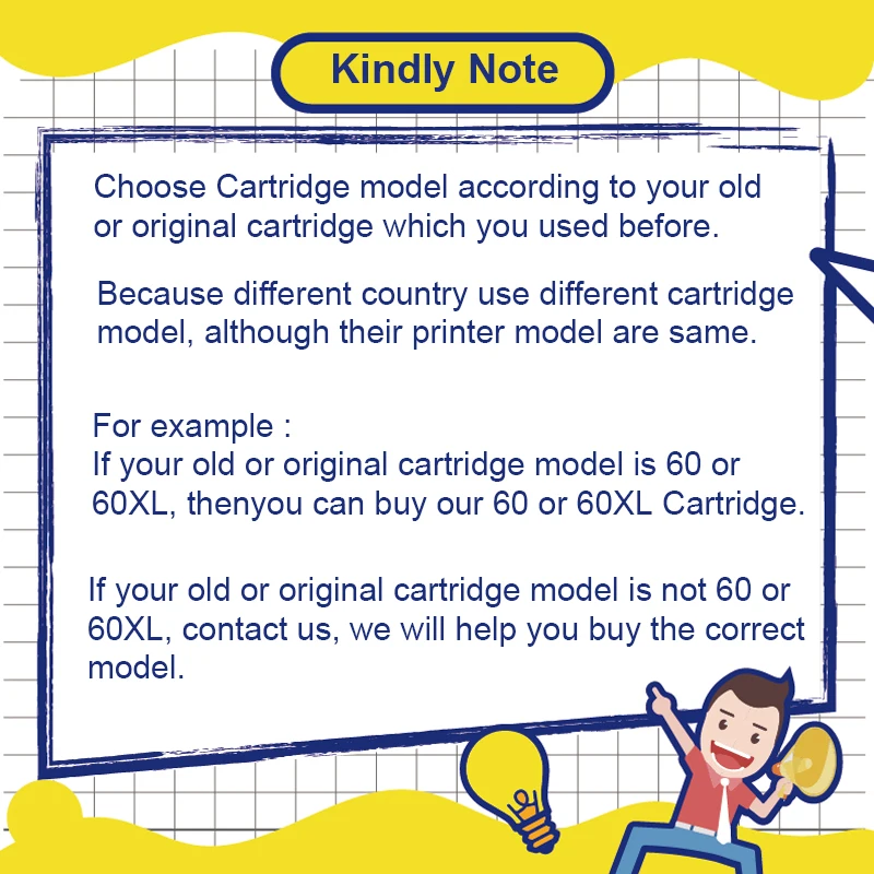 Если ваша модель чернильного картриджа не 60 или 60XL, пожалуйста, свяжитесь с нами, и мы поможем вам купить правильную модель.
