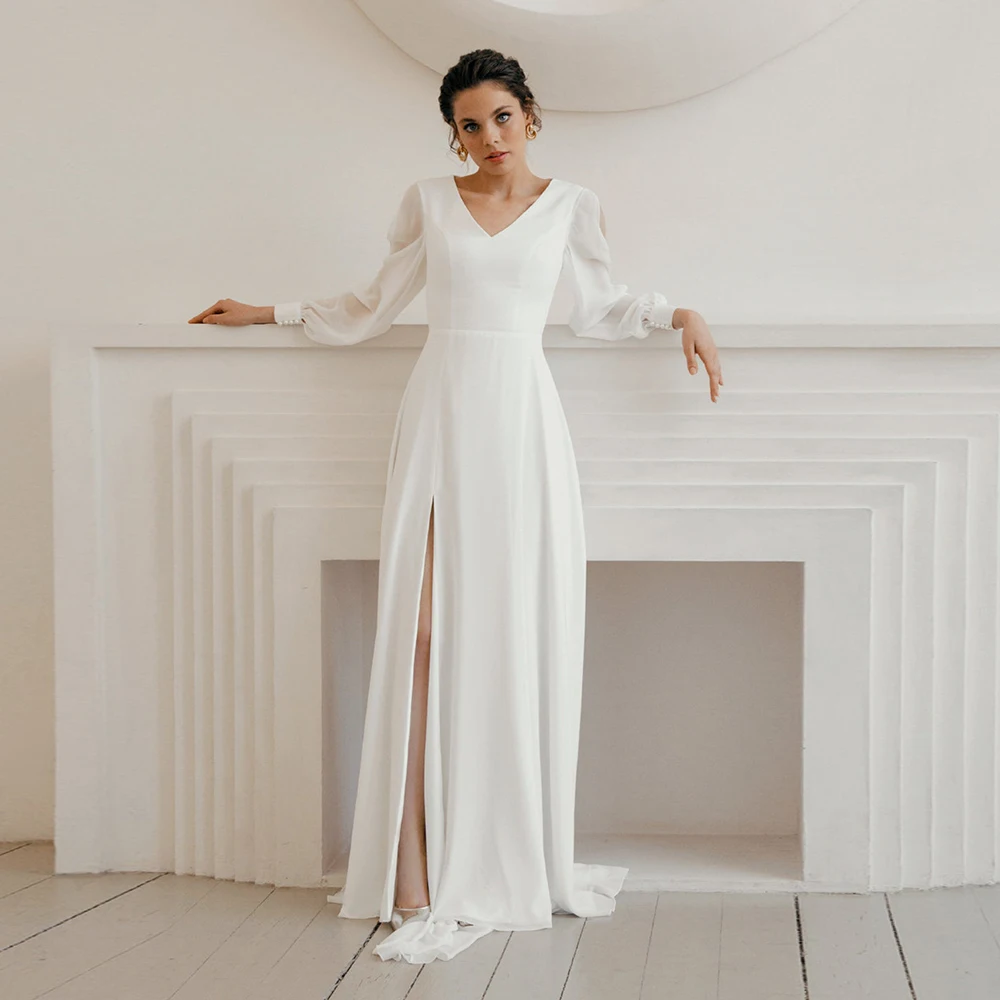 Женское шифоновое свадебное платье, элегантное белое однотонное платье невесты до пола с Боковым Разрезом и длинными рукавами, лето 2022