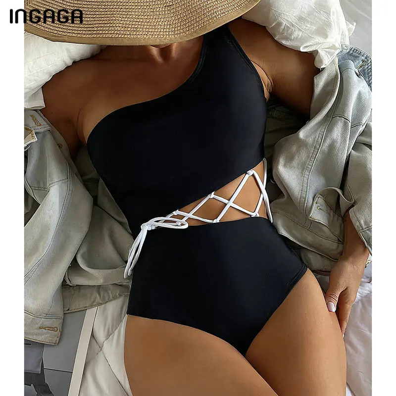 INGAGA слитный купальник со шнуровкой, женский купальник, сексуальный Монокини с вырезами, боди на одно плечо, новинка 2022, однотонная пляжная одежда с завязками спереди