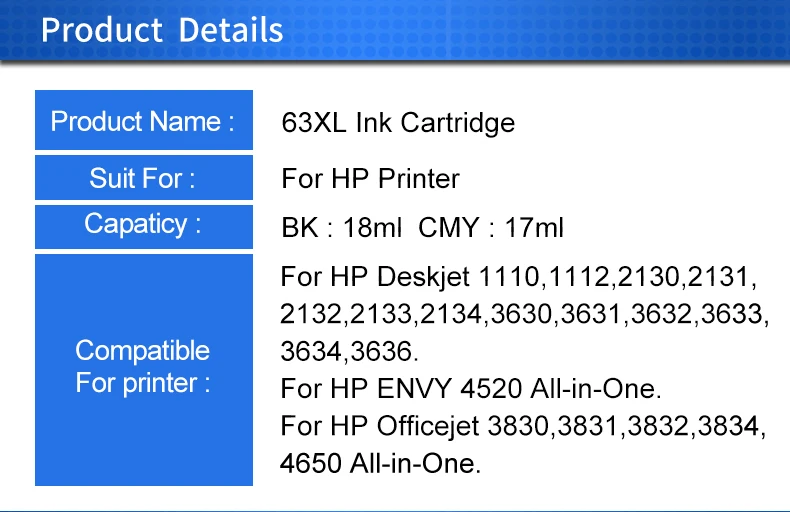 Если ваша старая или оригинальная модель чернильного картриджа составляет 63 или 63XL, вы можете купить наш картридж 63 или 63XL