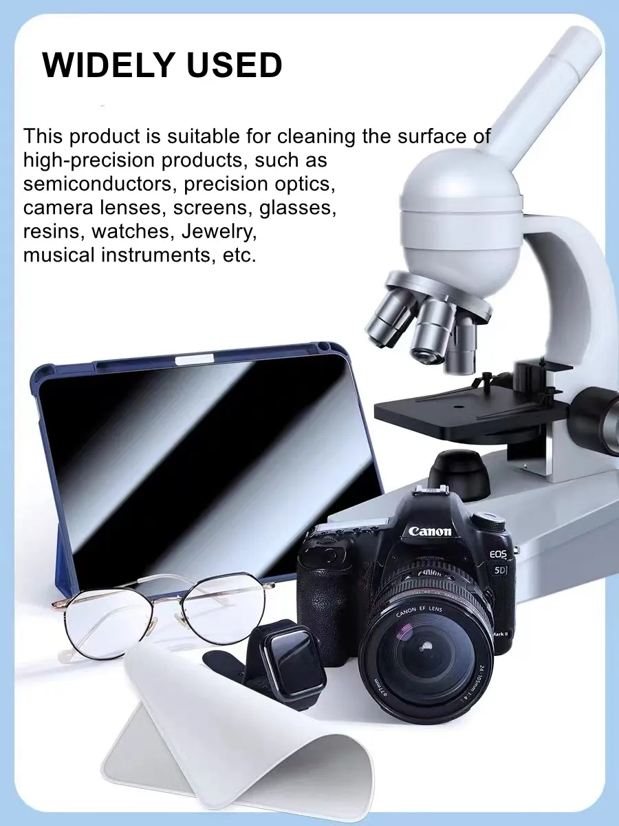 Feature 2This cloth is suitable for cleaning the surface of high-precision products, such as semiconductors, precision optics, camera lenses, screens, glasses, resins, watches, Jewelry, musical instruments,TV, Computer etc.