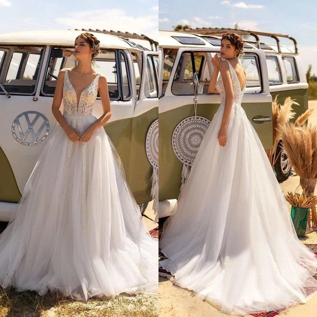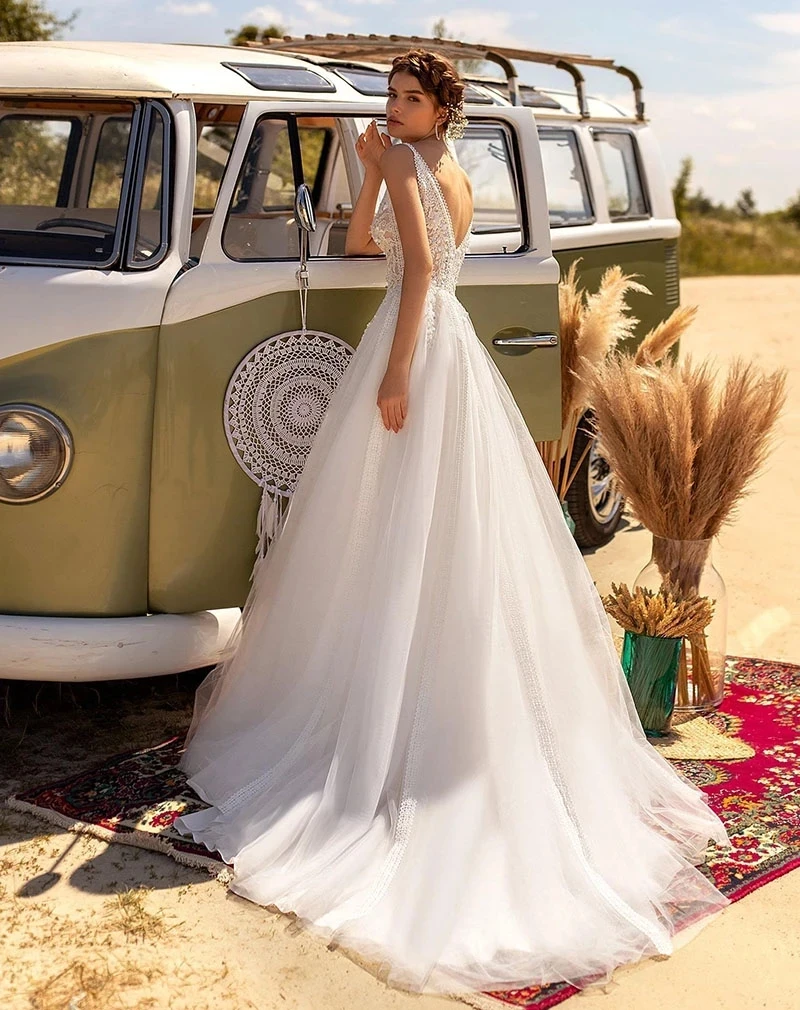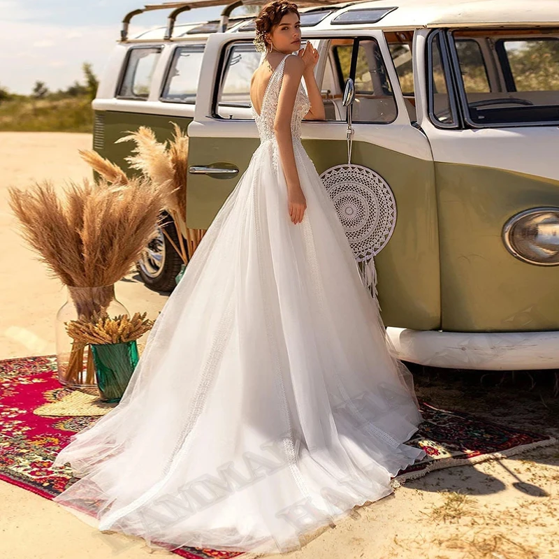KeywordsSexy Tulle V Neck Bohemian Wedding Dresses Gown Appliques Lace Backless Sposa Vestidos Bridal Party Robe De Mariée Cheap Wedding