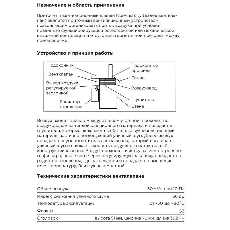 Подоконный приточный клапан Norvind city создает в комнате естественную приточную вентиляцию, что позволяет раз и навсегда решить проблему плесени, духоты и конденсата на окнах. Norvind city проветривает вместо открытого окна, сохраняя в доме тепло. Клапан Norvind сity устанавливается при монтаже окна без вмешательства в его конструкцию, при этом не требуется сверление стены. За счет разницы в давлении воздушный поток с улицы по воздуховодам затягивается в помещение. Клапан оснащен фильтром предварительной очистки класса G3, который не требует специального обслуживания. Устройство работает без электричества. Важным условием правильной работы клапана Norvind city является исправность вытяжных каналов на кухне и в санузлахКлапан Norvind сity разработан специально для строителей и оконных компаний. Он обеспечивает приток воздуха в 30 м3/ч при 10 Па, что соответствует требованиям СП 60.13330.2016 "Отопление, вентиляция и кондиционирование воздуха". Устройство не снижает шумоизоляцию окна. Клапан не виден с улицы и не требует согласований даже в исторических зданиях.