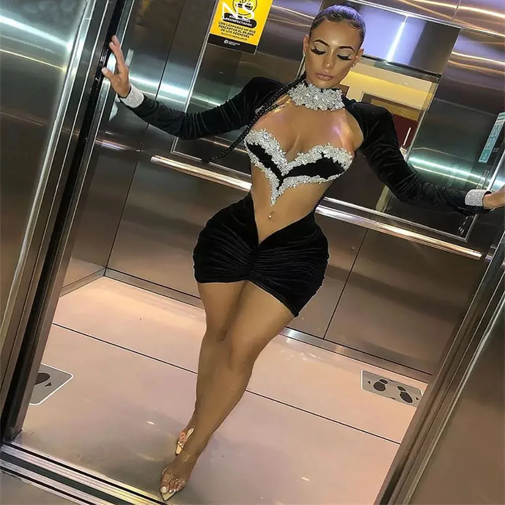 Женское платье для выпусквечерние вечера, черное платье с длинным рукавом и высоким воротом, украшенное бисером, большого размера