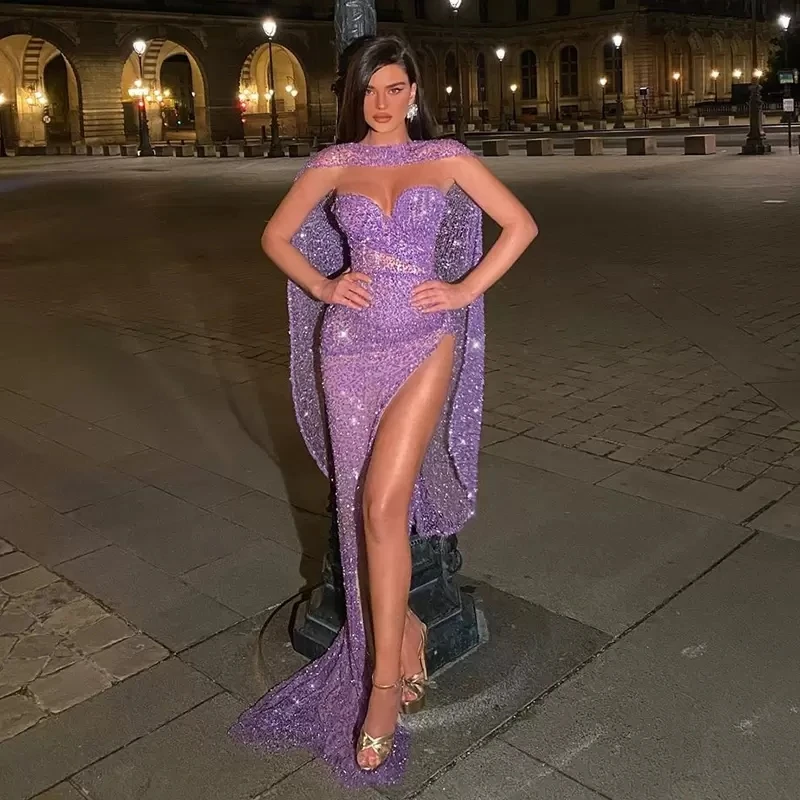 Фиолетовое вечернее платье с накидкой, сексуальное платье знаменитости с разрезом и красной ковровой дорожкой, вечерние наряды на выпускной, индивидуальный пошив, свадебное платье
