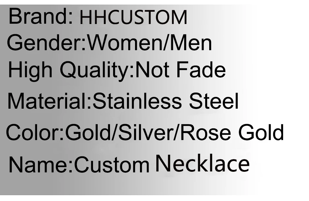 Пожалуйста, пришлите нам имя, которое вы хотите заказать. Если вы не дадите нам имя по индивидуальному заказу, мы свяжемся с вами. Если вы все еще не ответите через три дня, мы сделаем ожерелье в соответствии с именем вашего получателя. Вы не можете отменить ваш заказ в течение 12 часов, потому что мы уже начали производство и надеемся получить ваше понимание у нас есть собственный завод по производству, если вам нужна оптовая или Прямая поставка и оптовая торговля, пожалуйста, свяжитесь с нами.