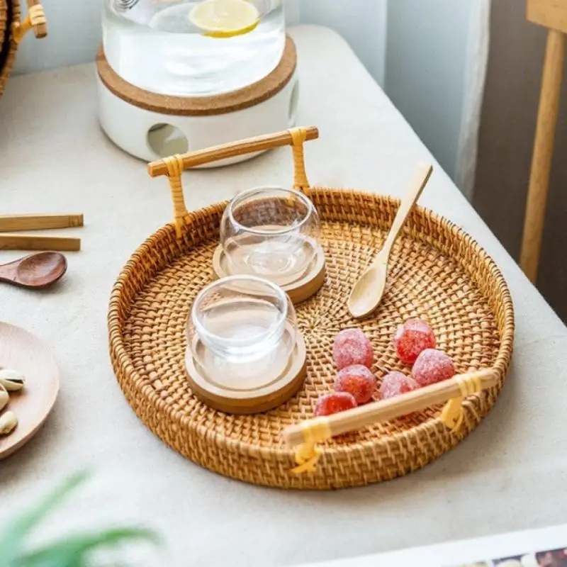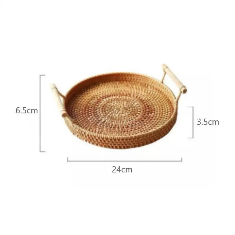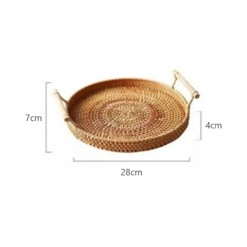 Плетеный вручную круглый поднос из ротанга с деревянной ручкой, плетеная корзина, тарелка для хлеба, закусок, тарелка для фруктов, тортов, контейнер для хранения фруктов и еды, чайные подносы