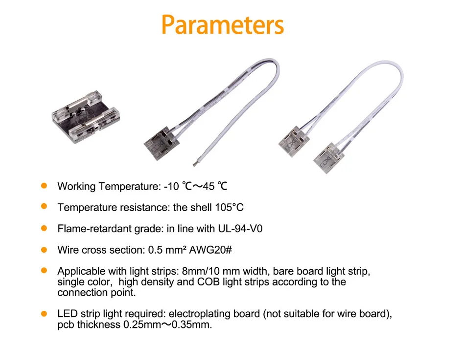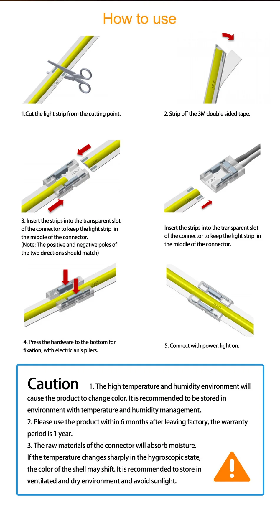 1. Пожалуйста, внимательно проверьте перед тем, как нажать медную пластину, как только медная пластина заблокирована, ее трудно сбросить.2. Мы советуем использовать плоскогубцы, чтобы убедиться, что разъем полностью зажат3. Пожалуйста, выберите правильную ширину разъема для светодиодной ленты.