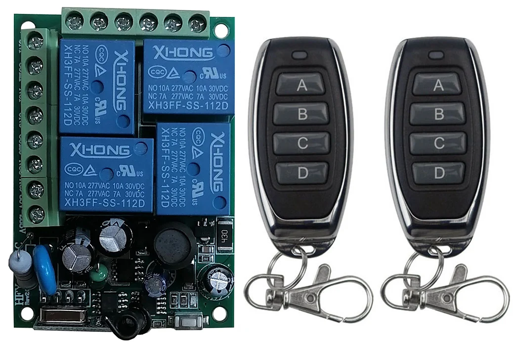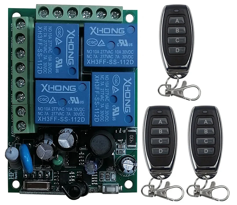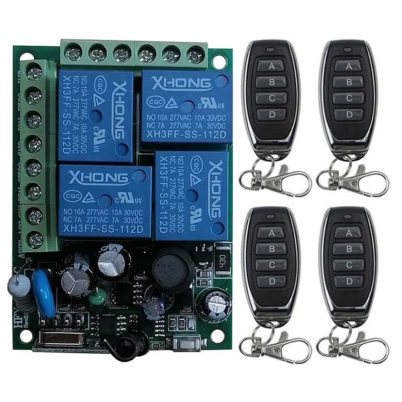 Нажмите одну кнопку в течение одного времени, соответствующий канал работает/включается; Нажмите другую кнопку остановки/выключения (в то же время другой соответствующий канал работает).(4-канальный переключатель (приемник) Требуется 4 кнопки дистанционного управления (передатчик).