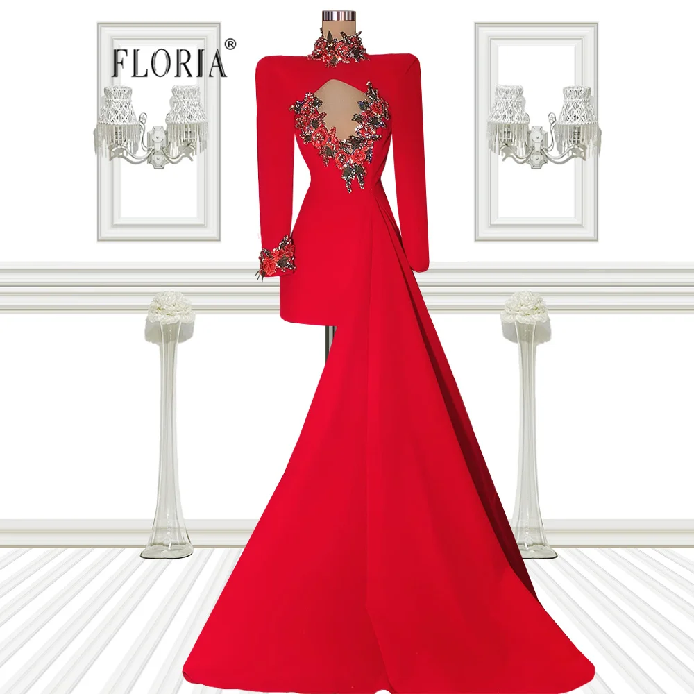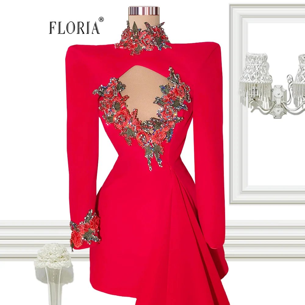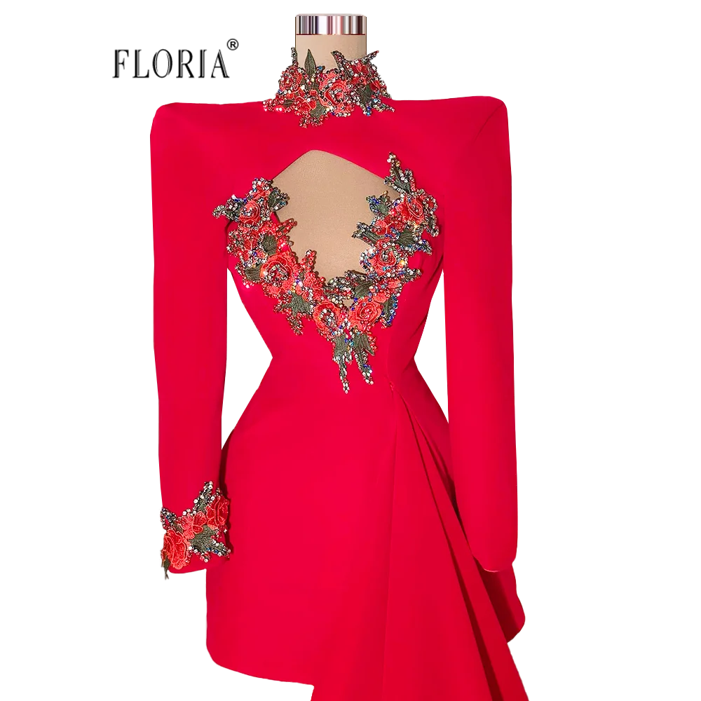 Красное коктейльное платье Floria, новинка 2022, Короткие вечерние мини-платья с длинными рукавами и вышивкой из бисера со шлейфом