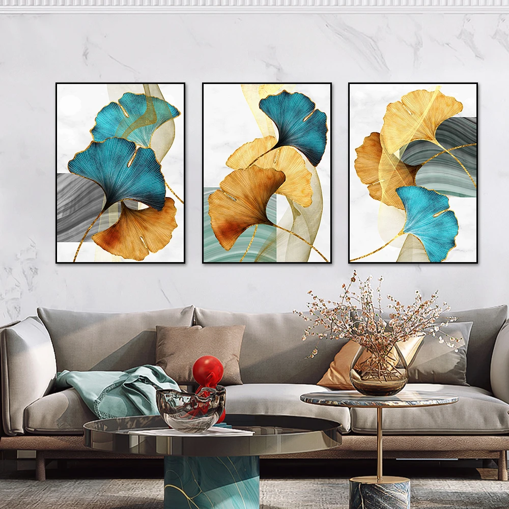 Синий зеленый желтый золотой растительный лист абстрактный плакат скандинавский холст печать настенная художественная картина современного искусства украшение для гостиной
