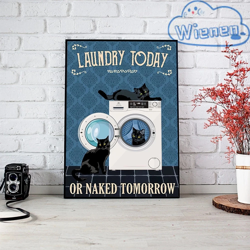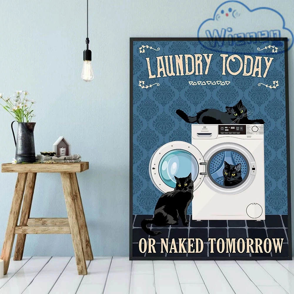 Винтажная забавная черная кошка стирка сегодня стирка Печать холст картина настенные картины для стирки комната стирка домашний декор