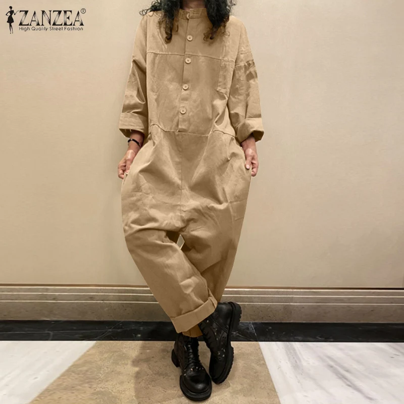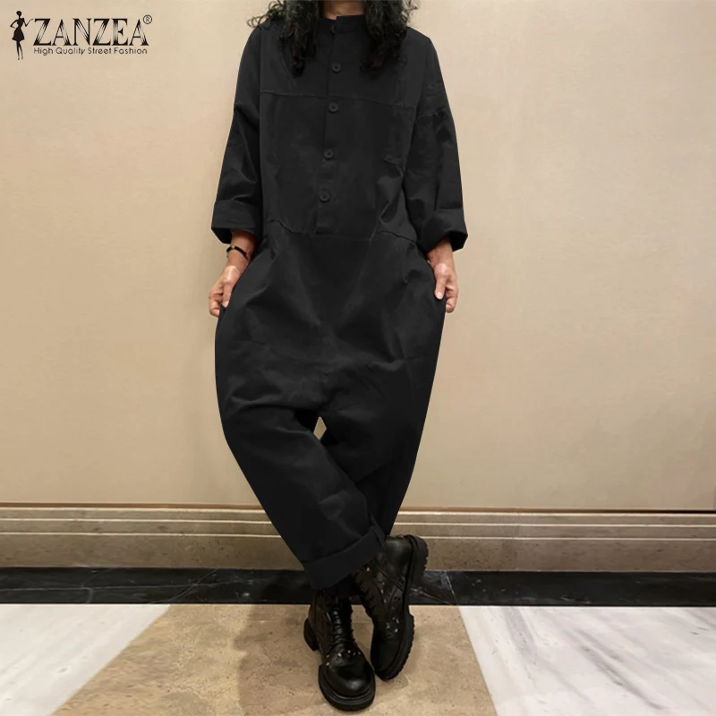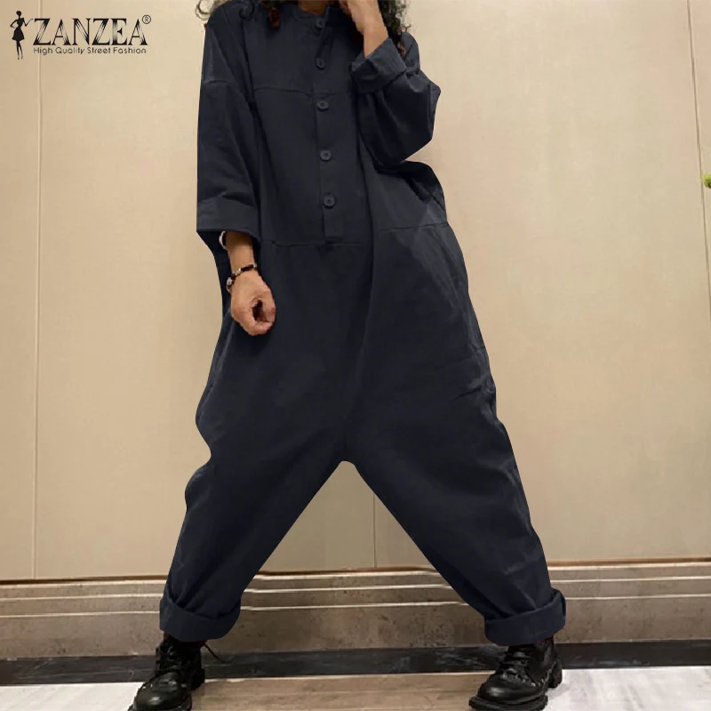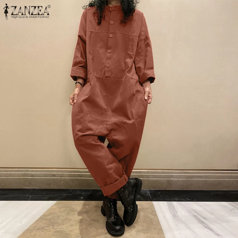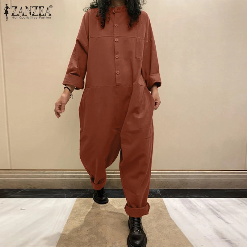 Повседневный длинный комбинезон, свободные однотонные Комбинезоны на пуговицах ZANZEA, женские винтажные комбинезоны с длинным рукавом и шаговым швом, Осенние Комбинезоны большого размера