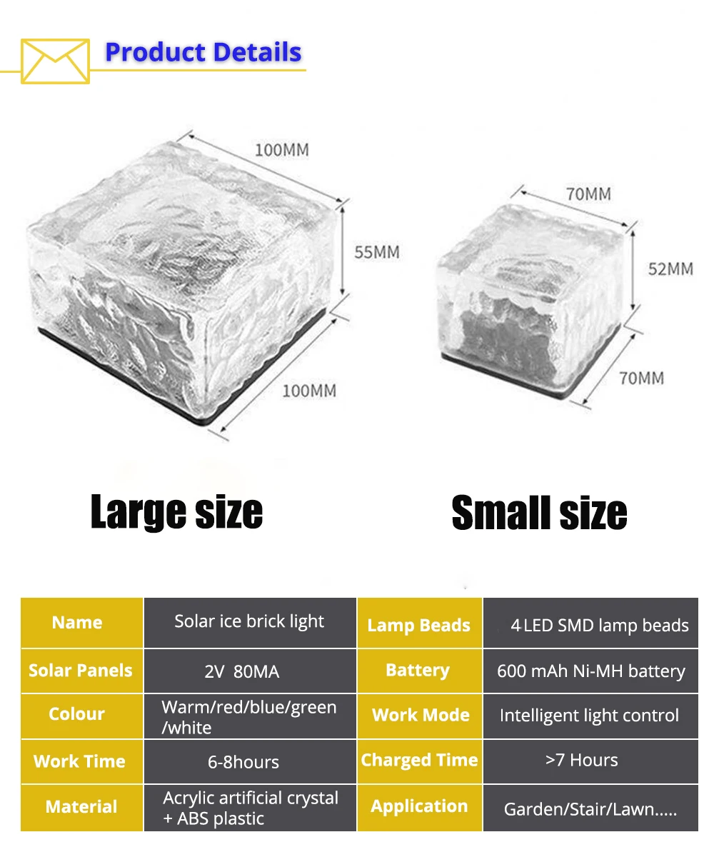 Название: солнечный ледяной кирпич светильникБусины лампы: светодиодный бисерСолнечная панель: 2 В/100 мАч поликремнийАккумулятор: 600 мАч Ni-MH аккумуляторМаленький размер: 7x7x5,2 смБольшой Размеры: 10x10x5.5cmЦвет: белый, теплый, желтый, красный, синий, зеленый, цветРежим работы: умный светильникМатериал: акриловый искусственный кристалл + АБС-пластикПрименение: сад/Лестница/газон