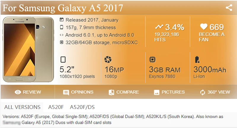 Номер моделиA5 2017 A520 A520F SM-A520F A520L A520K A520M A520W