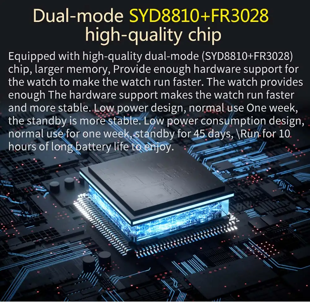 ЦП: SYD8810 + FR3029BT-версия: BT 5,0Совместимость ОС: Android 5,0 или выше, iOS 9,0 или вышеРежим работы: полноразмерный сенсорный экран HDВодонепроницаемость: IP67Размер экрана: 1,69 дюйма TFTРазрешение: 320*385 пикселейЕмкость аккумулятора: 195 мАчВремя работы в режиме ожидания: около 12 днейВремя использования: около 1-2 днейВремя зарядки: около 2,5 часовМощность питания: 5V/1AТип зарядки: зажим для зарядки