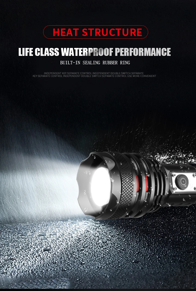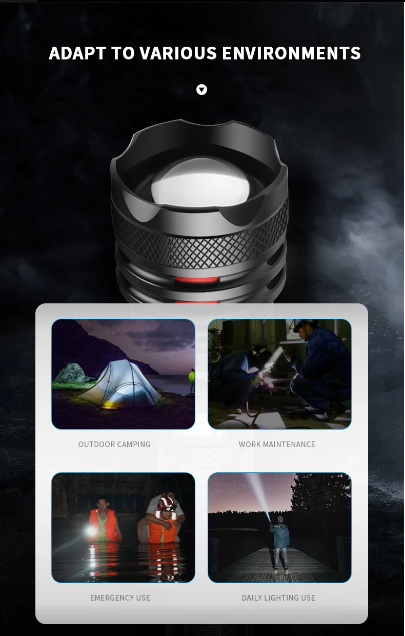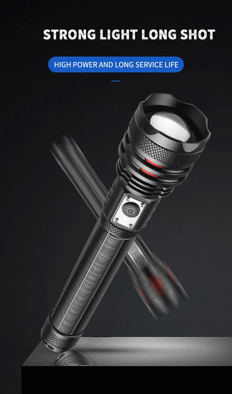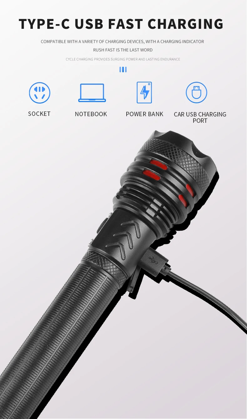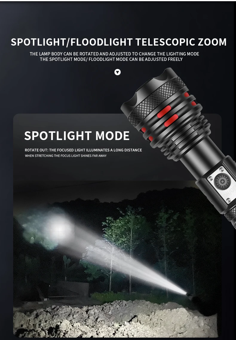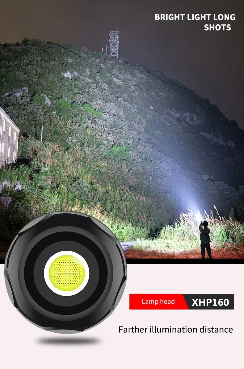 XHP160 светодиодный фонарикСупер яркий Перезаряжаемый светодиодный светильник XHP160 может фокусироваться и освещать 1500 метров, и он может осветить ваше окружение. Обеспечьте вам супер яркий белый светильник ночью. Срок службы> 100000 часов.