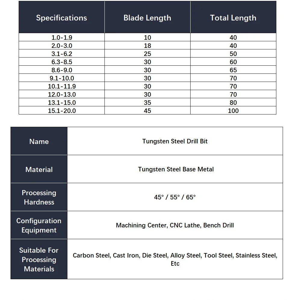 Название: сверло из вольфрамовой сталиМатериал: базовый материал из вольфрамовой сталиТвердость: HRC55 °Размер: 0,5 мм-20 ммОборудование конфигурации: обрабатывающий центр, токарный станок с ЧПУ, скамья дрельПрименимые материалы обработки: углеродистая сталь, чугун, литая сталь, легированная сталь, инструментальная сталь, нержавеющая сталь и т. д.
