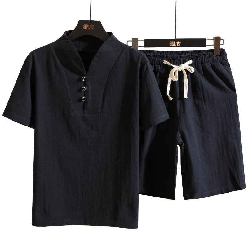 Летний льняной костюм, мужская хлопковая и льняная футболка с короткими рукавами размера плюс, Молодежные шорты из двух предметов, городская Домашняя мужская одежда