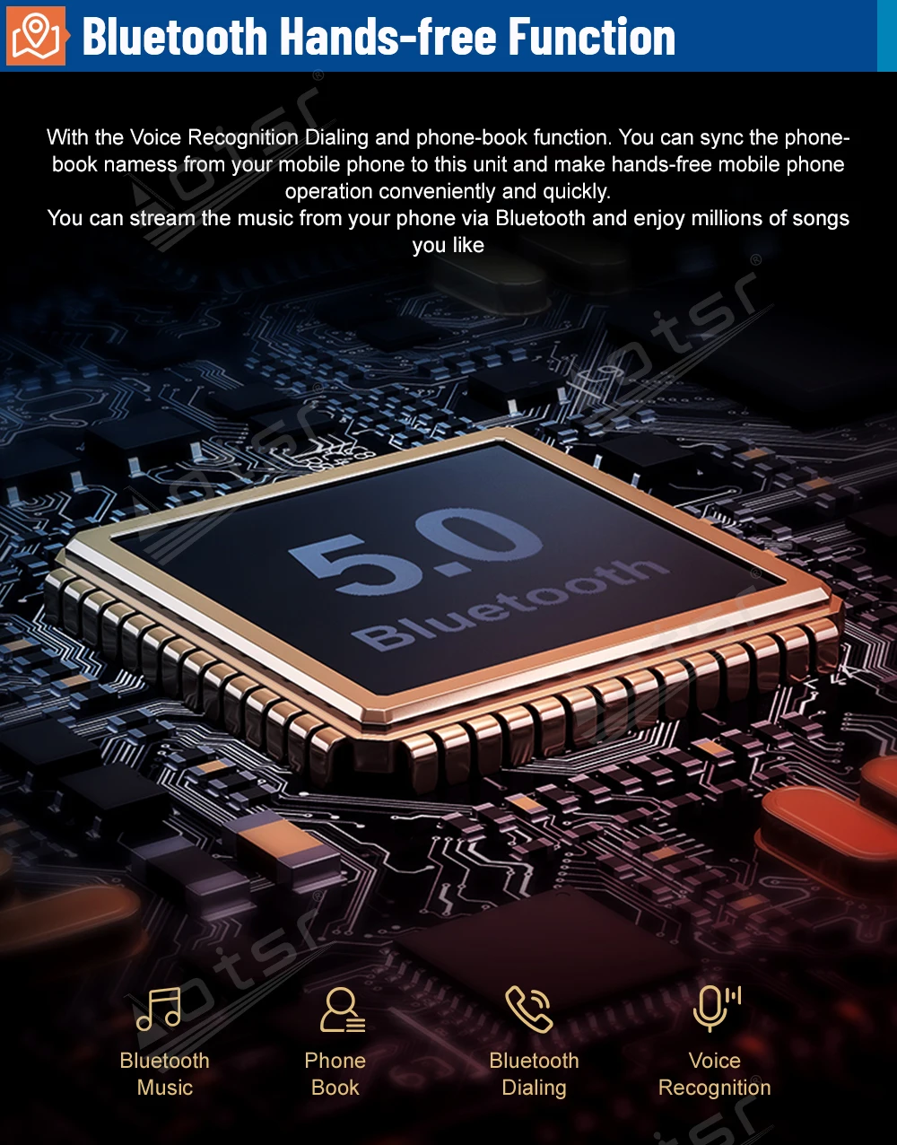 7.Bluetooth поддерживает все бренды мобильных телефонов, ввод телефонной книги, воспроизведение музыки, Поддержка поиска имени по A-Z