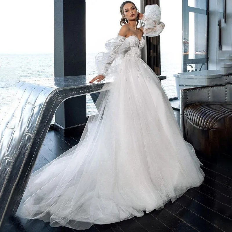 Платье свадебное со съемным пышным рукавом, ТРАПЕЦИЕВИДНОЕ, из тюля