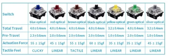 Тип корпуса оси: синий/красный/черный/коричневый/желтый/серебристый/зеленый (оптические переключатели)