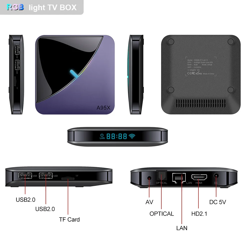 Приставка Смарт-ТВ VONTAR A95X F3 Air II RGB, Android 11, Amlogic, 4 + 6432 ГБ, 2 + 16 Гб Support BT Dual Wifi 4K Youtube Media Player